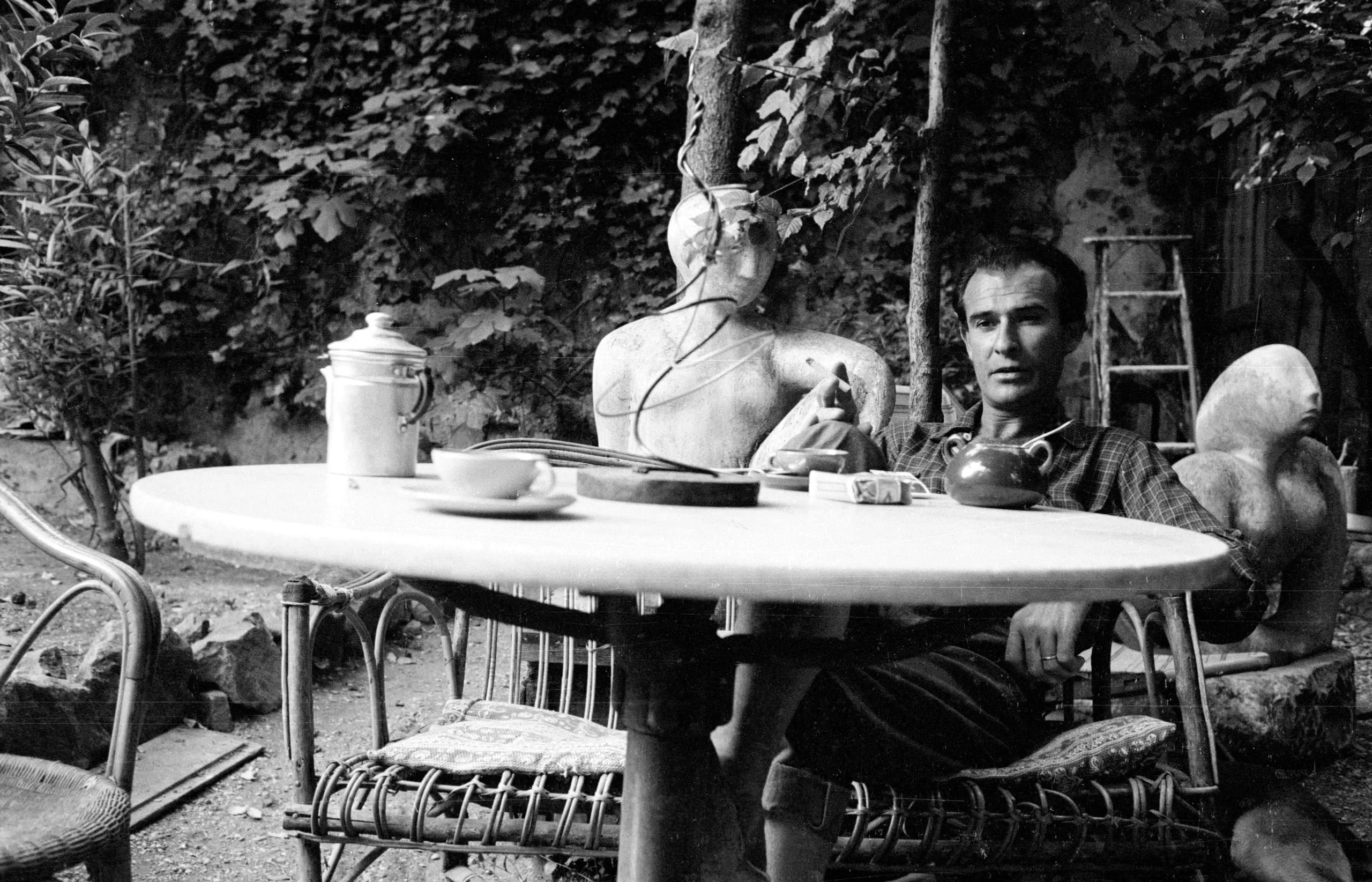 Black and white photograph of a young man seated in a wicker chair at a round outdoor table, holding a cigarette, with abstract sculptures visible nearby