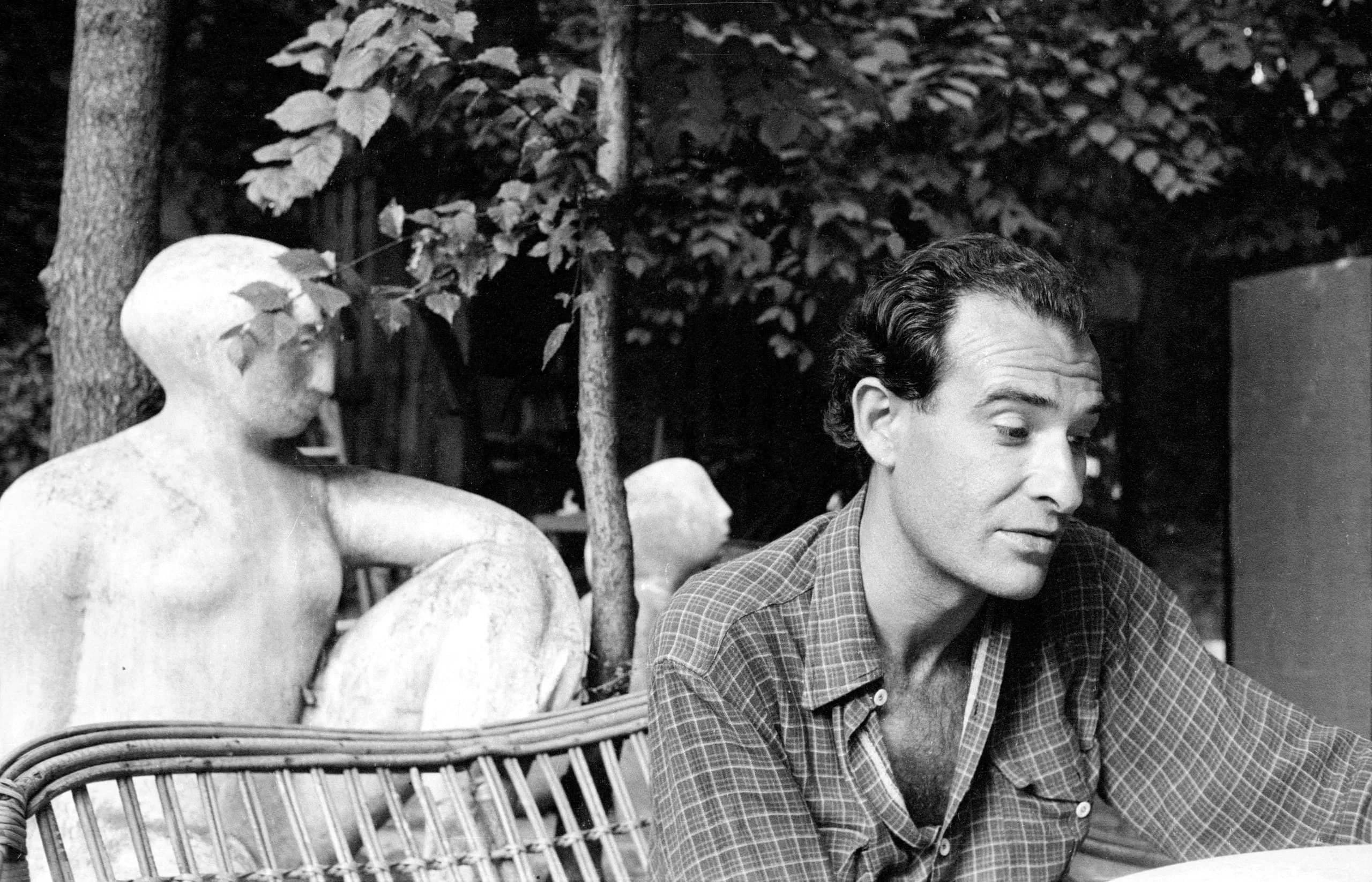 Black and white photograph of a dark-haired man in a plaid shirt leaning forward outdoors, with a pale stone sculpture of a seated figure visible behind him among trees