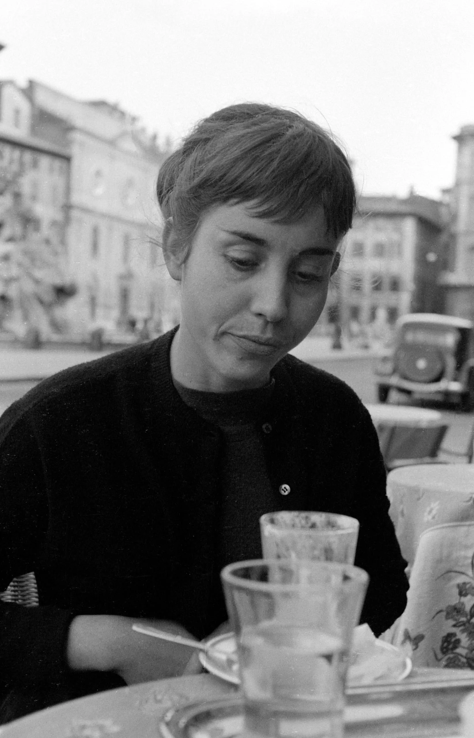 Black and white photograph of a white woman with a short dark pixie cut, seated at an outdoor café table, head tilted down, wearing a dark cardigan