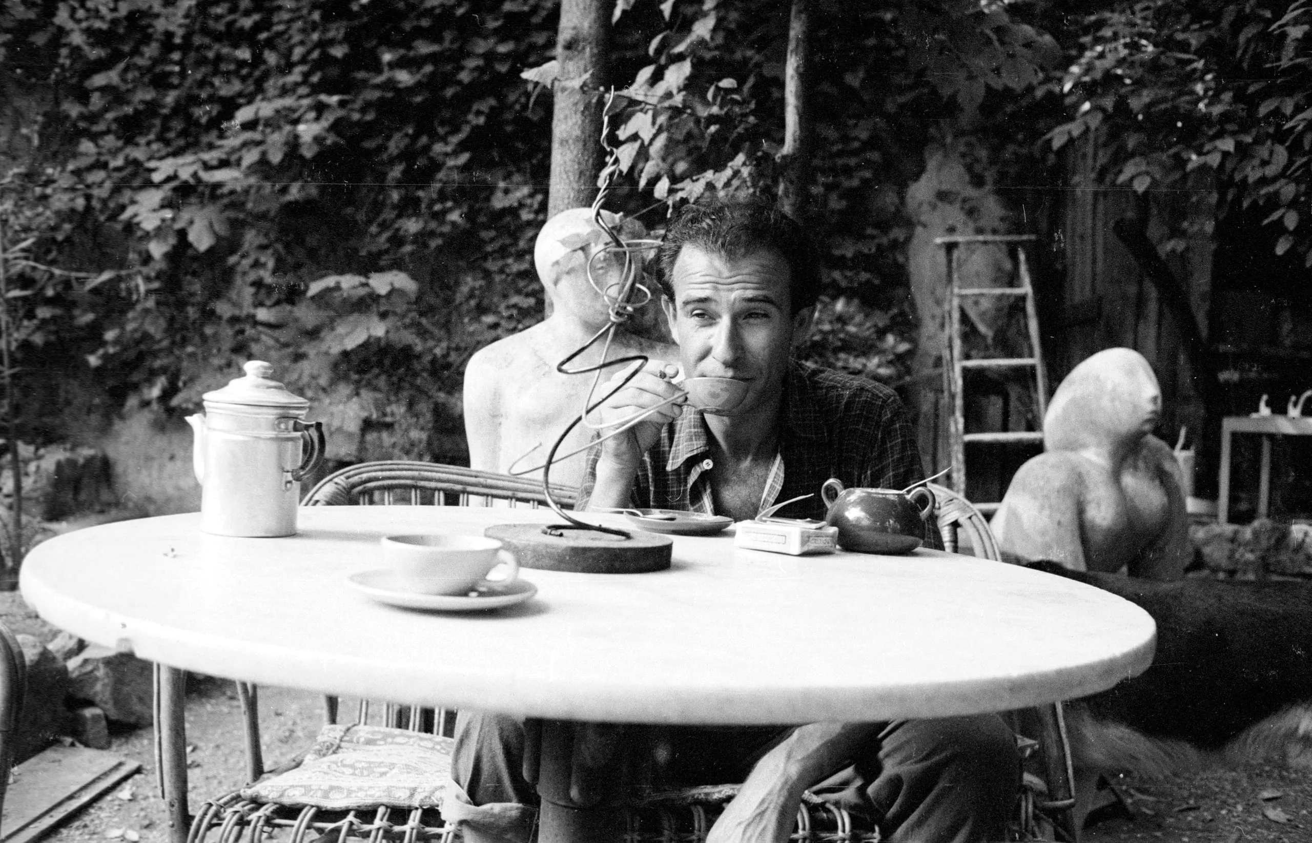 Black and white photograph of a man leaning close over a round outdoor table, surrounded by large sculptures in a garden setting