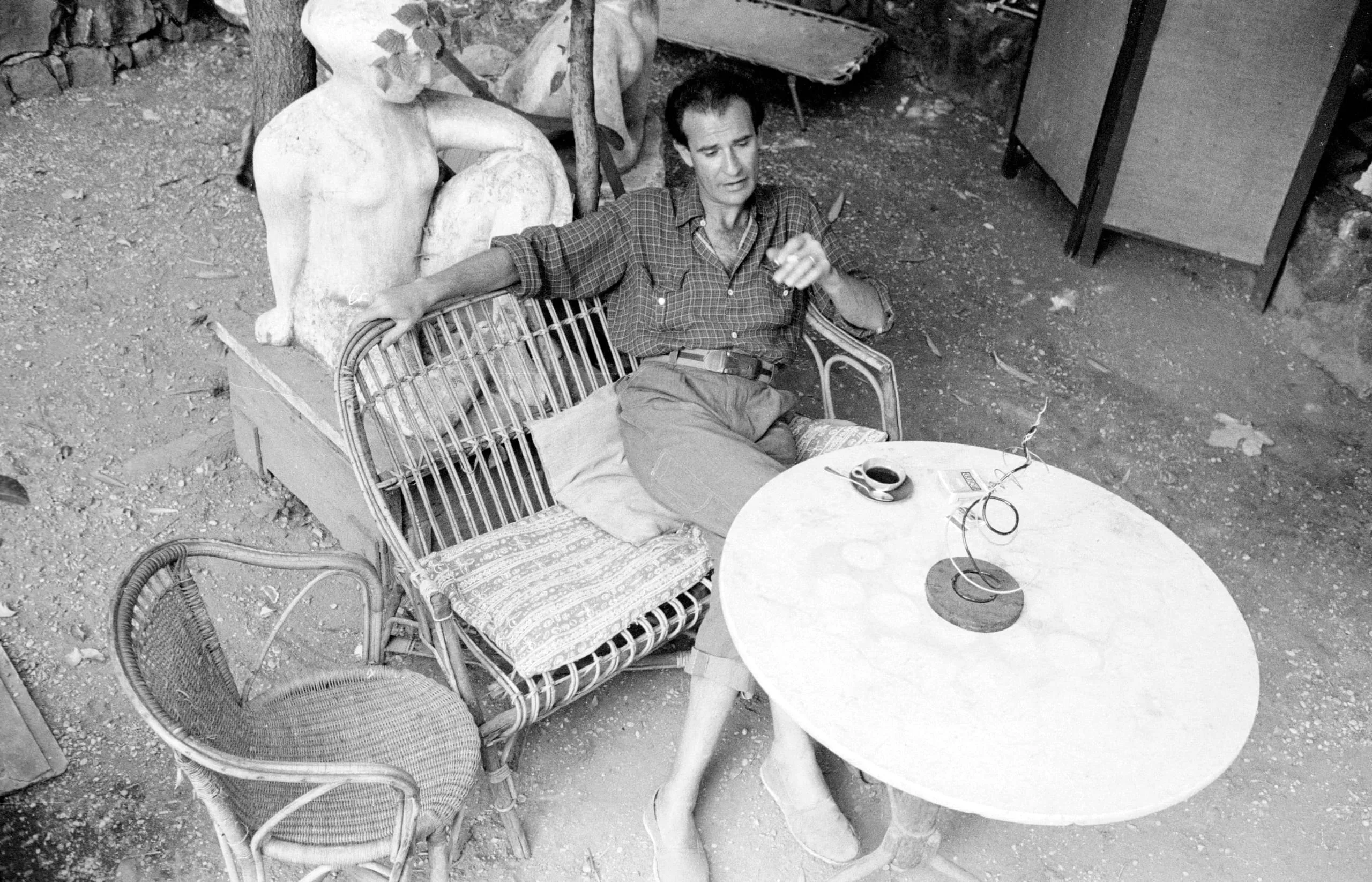 Black and white photograph of a man in a plaid shirt and shorts seated in a wicker chair outdoors, with a large figurative stone sculpture behind him