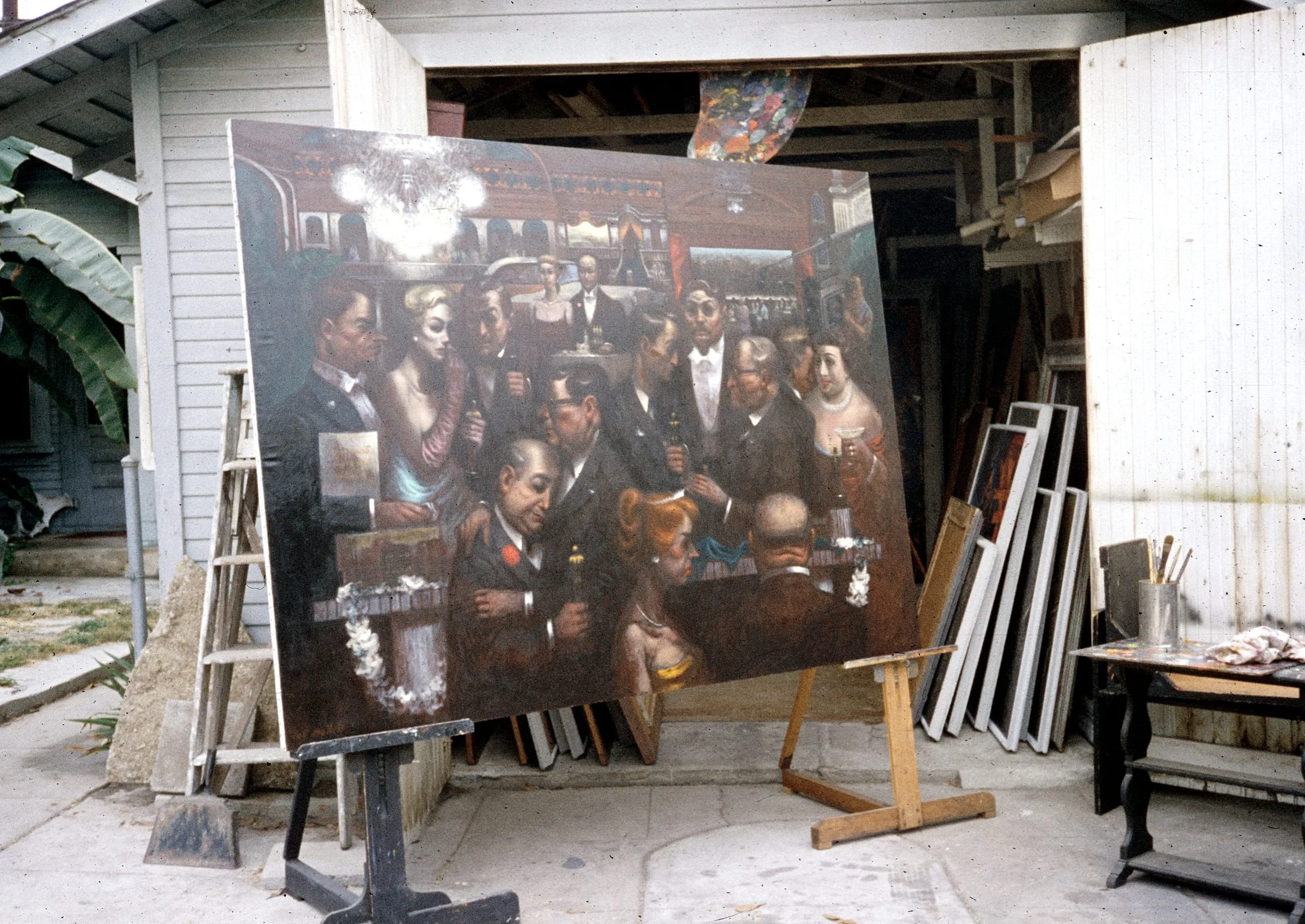 Color photograph of a large figurative oil painting on an outdoor easel, depicting a crowded bar scene with formally dressed figures under a chandelier, surrounded by artist's studio materials