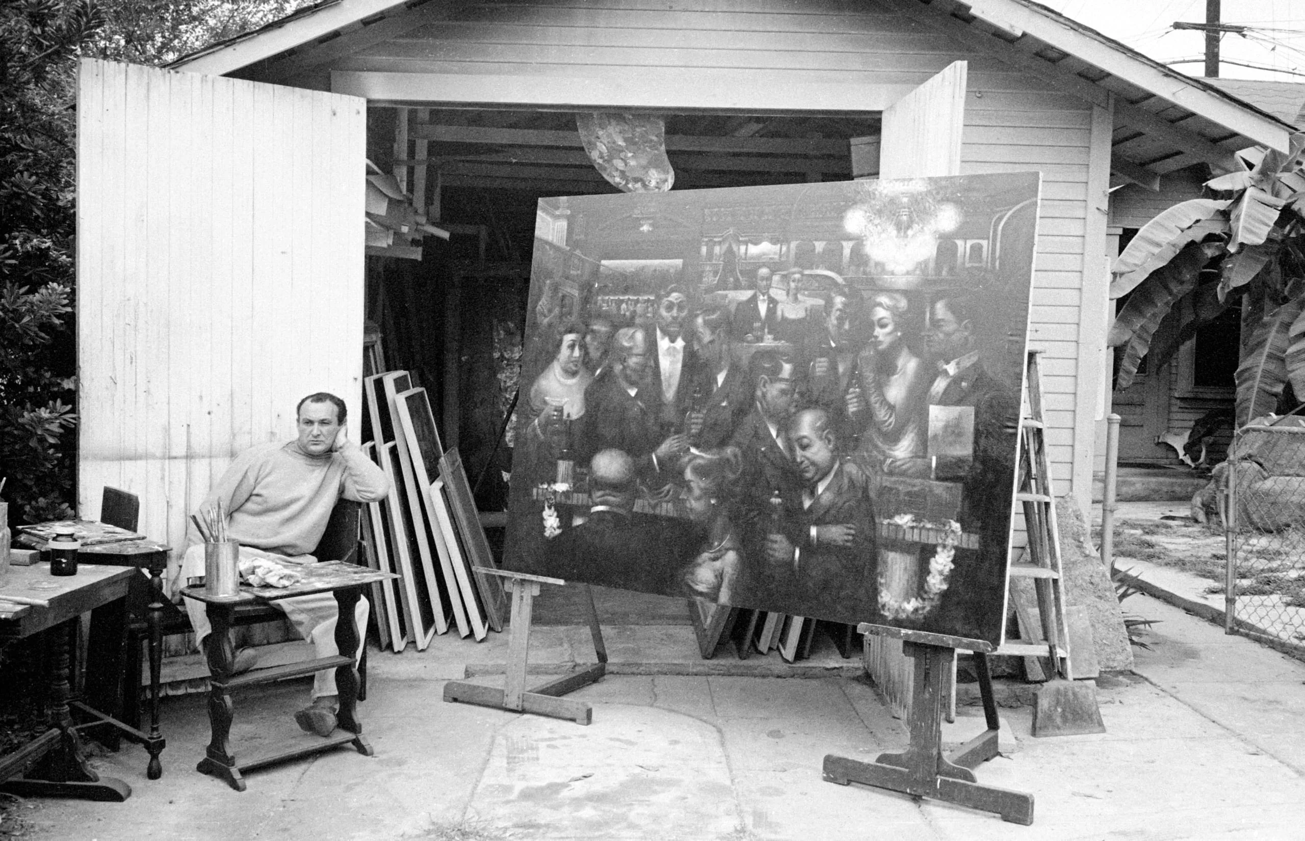 Black and white photograph of a man seated beside a massive figurative painting on an easel outside a garage studio, with brushes and palette on a small table nearby