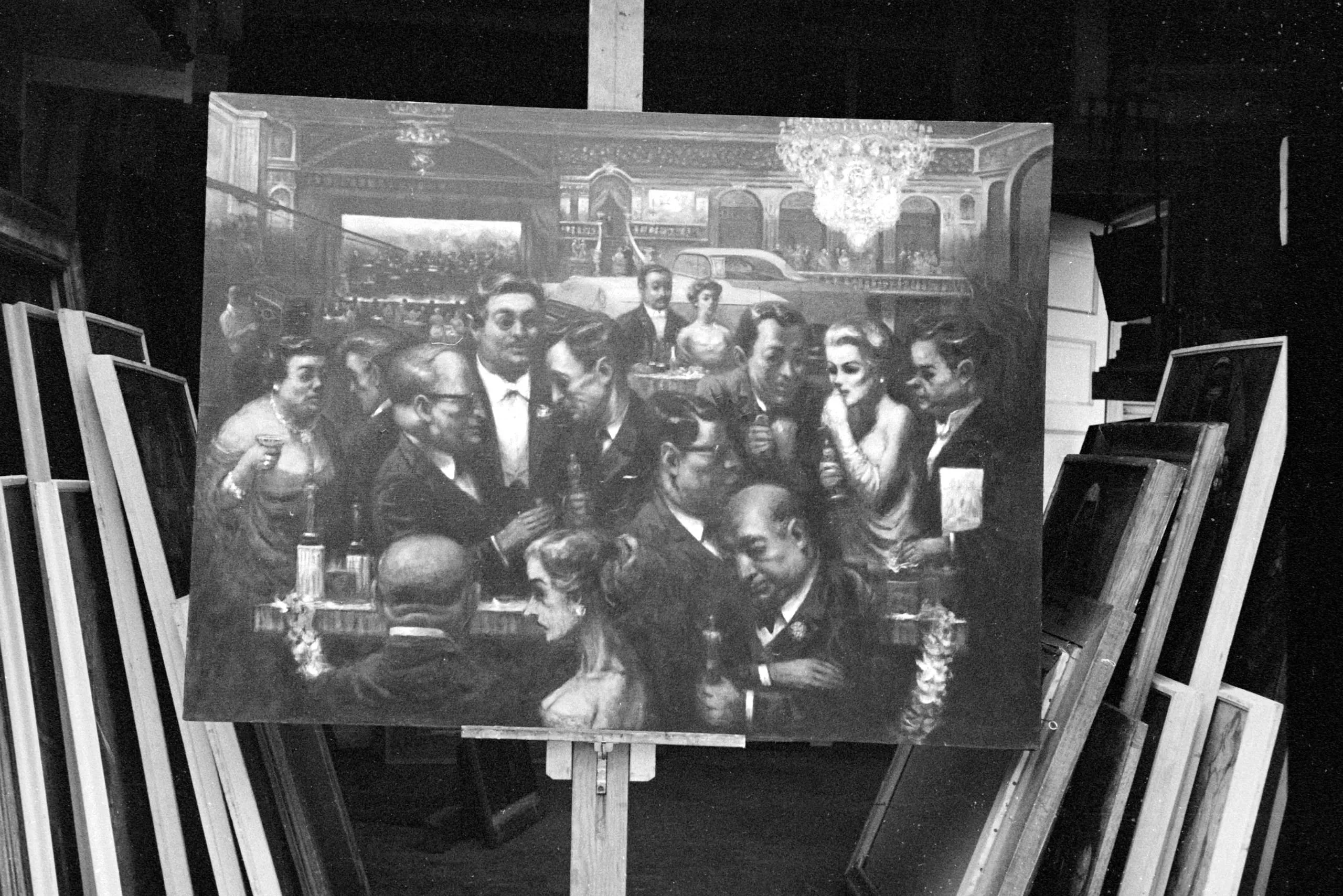 Black and white photograph of a large narrative painting on an easel, depicting a densely packed crowd of formally dressed figures in a grand interior with a chandelier