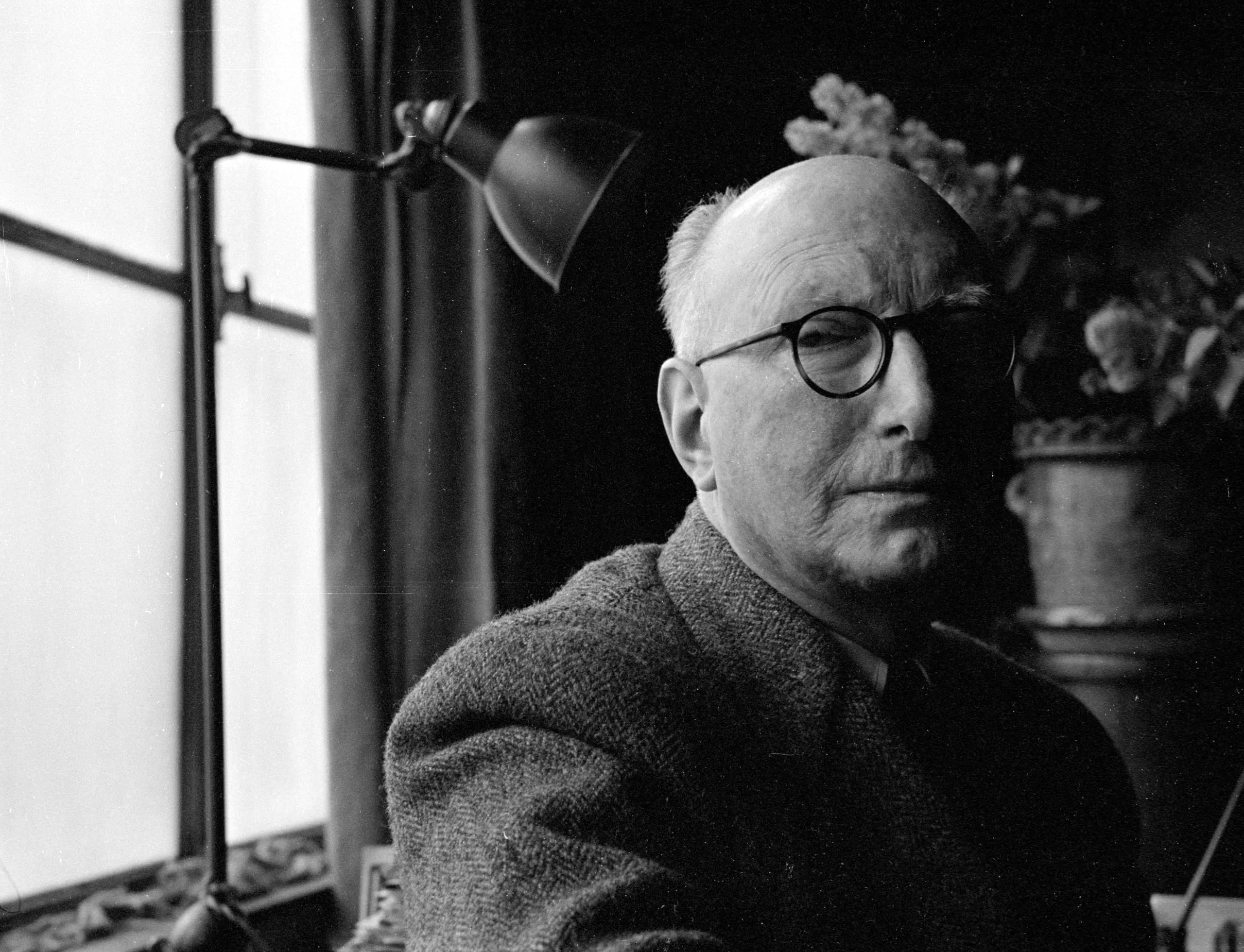 Black and white portrait photograph, bald white man in three-quarter profile wearing round glasses and a tweed jacket, seated near a bright window with a desk lamp behind him