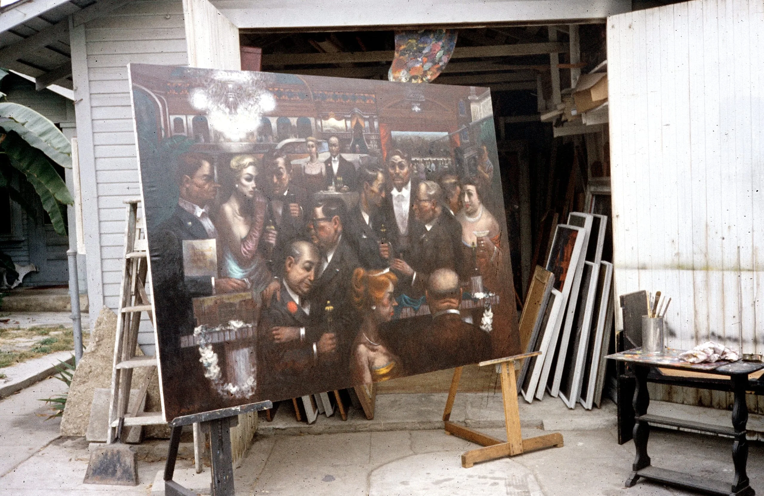 Large oil painting on an outdoor easel depicting a crowd of formally dressed figures in a dimly lit interior, rendered in dark browns and blacks with pale highlights
