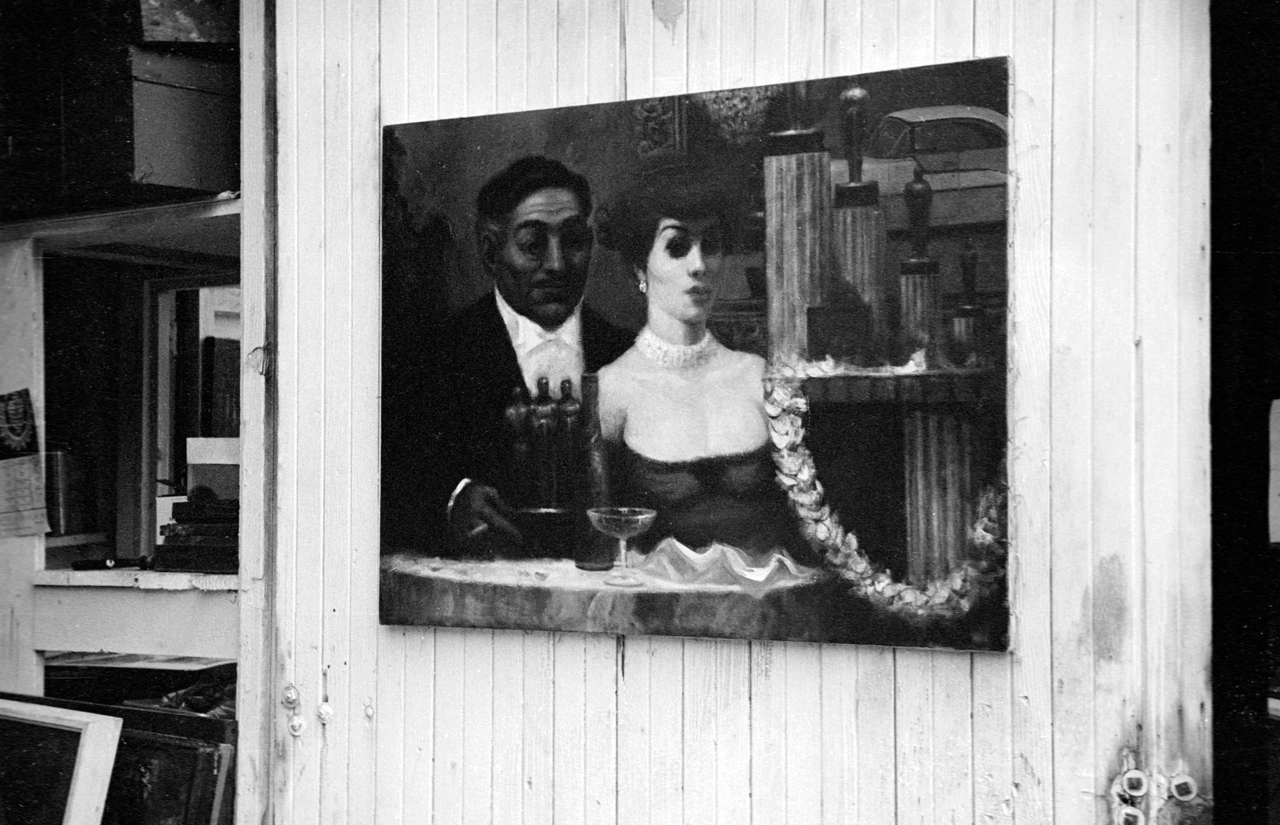 Black and white photograph of a painting hung on a white plank wall, depicting a Black man in formal dress and a white woman in an evening gown standing behind a bar with cocktail glasses
