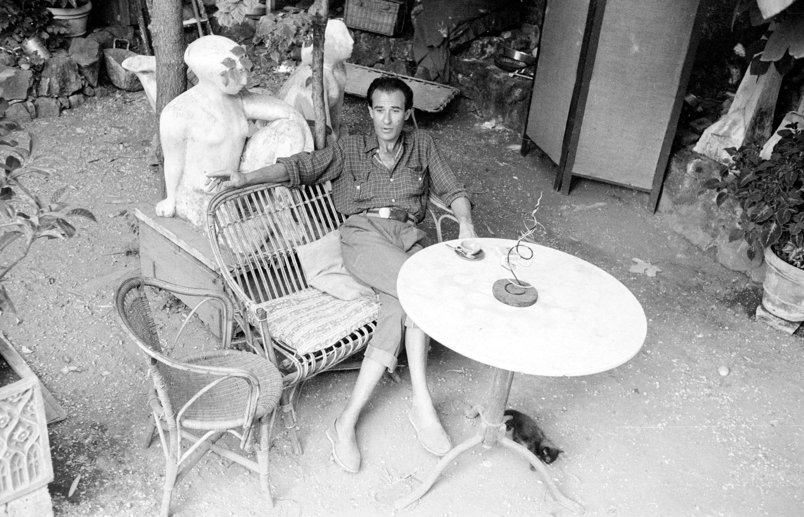 Black and white photograph of a man seated in a wicker chair outdoors beside an unfinished plaster sculpture, with a small round table to his right