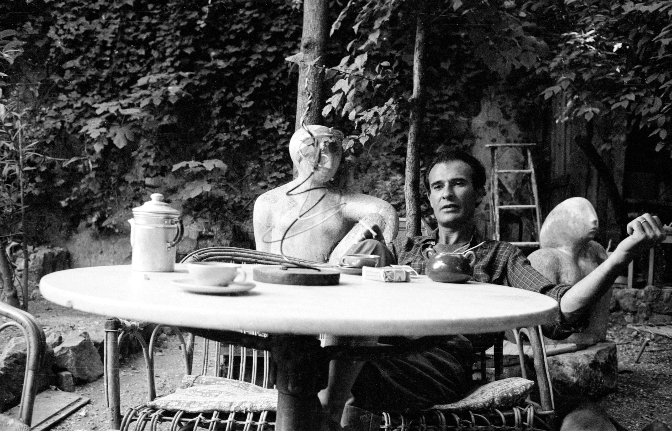 Black and white photograph of a man in a plaid shirt seated at a round outdoor table beside a large, rough-textured figurative sculpture