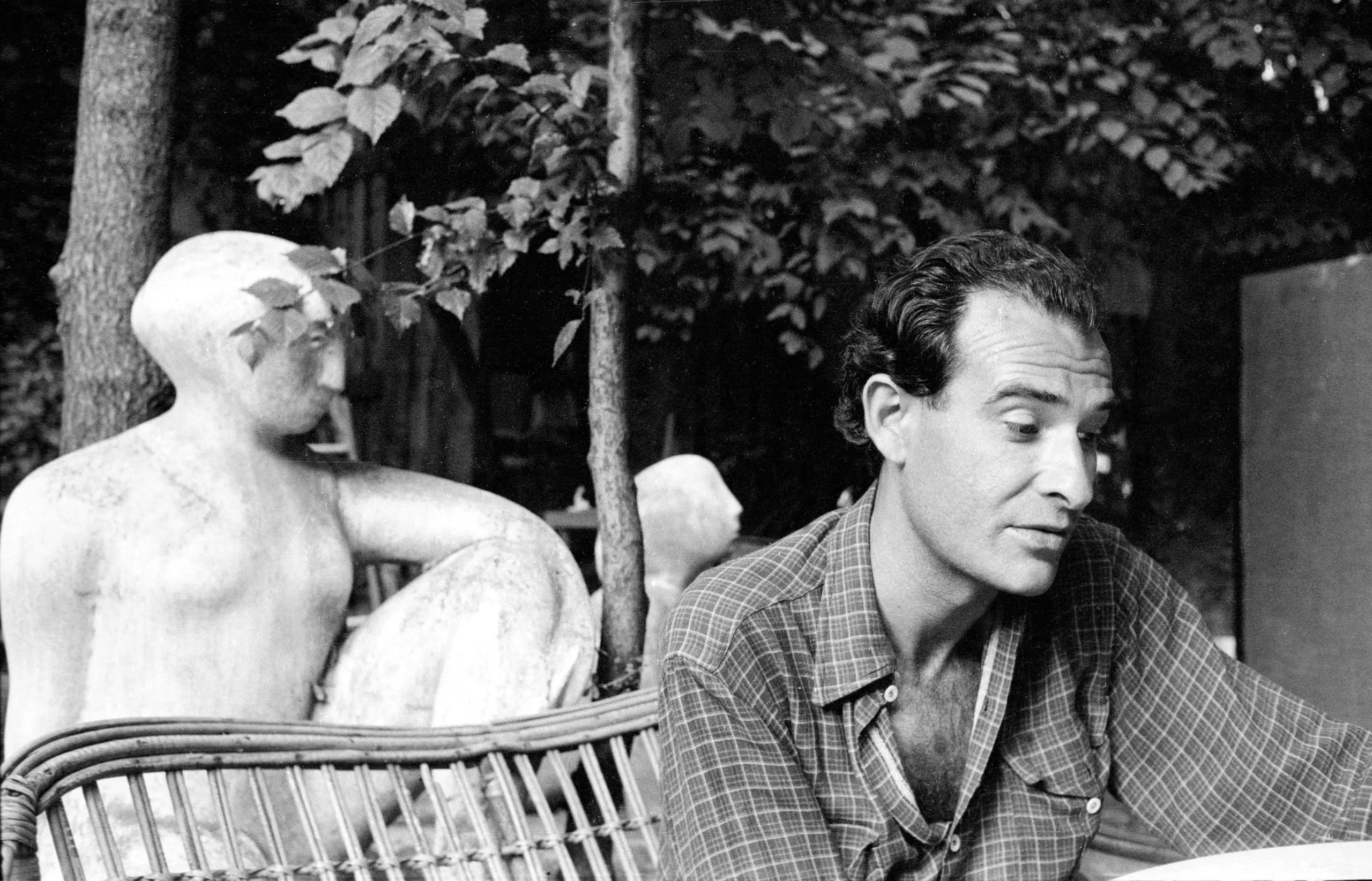 Black and white photograph of a man in a plaid shirt seated in a wicker chair, leaning forward, with a rough stone or plaster figurative sculpture beside him and trees behind