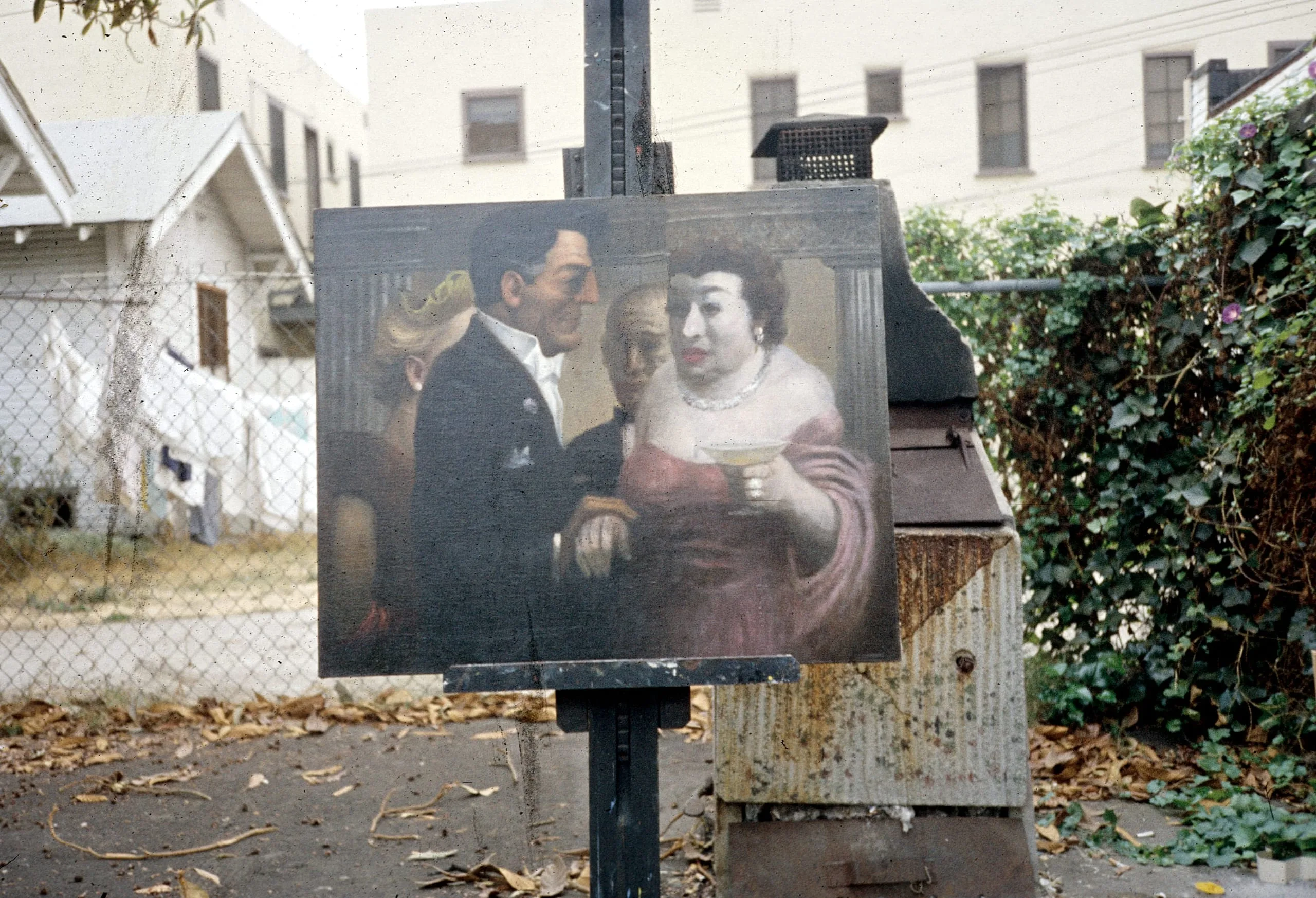 Color photograph of a realist oil painting on an outdoor easel, depicting three figures at a social gathering — a man in a tuxedo leaning toward a pearl-necklaced woman holding a cocktail glass