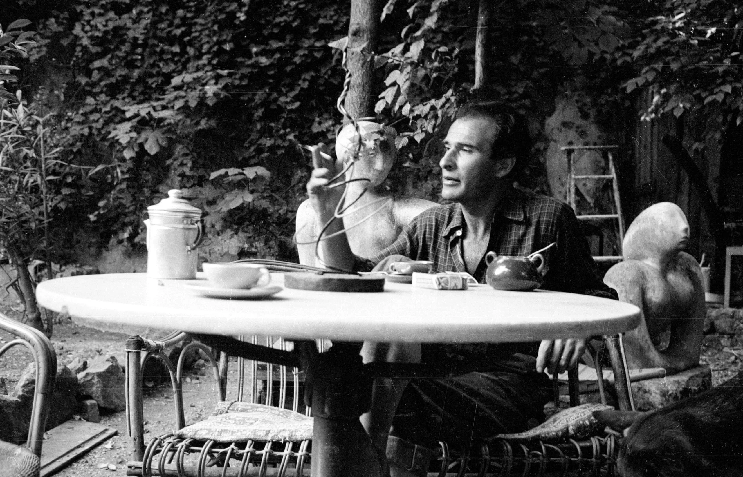 Black and white photograph of a man seated at a round outdoor table surrounded by sculptural figures, looking up and to the right