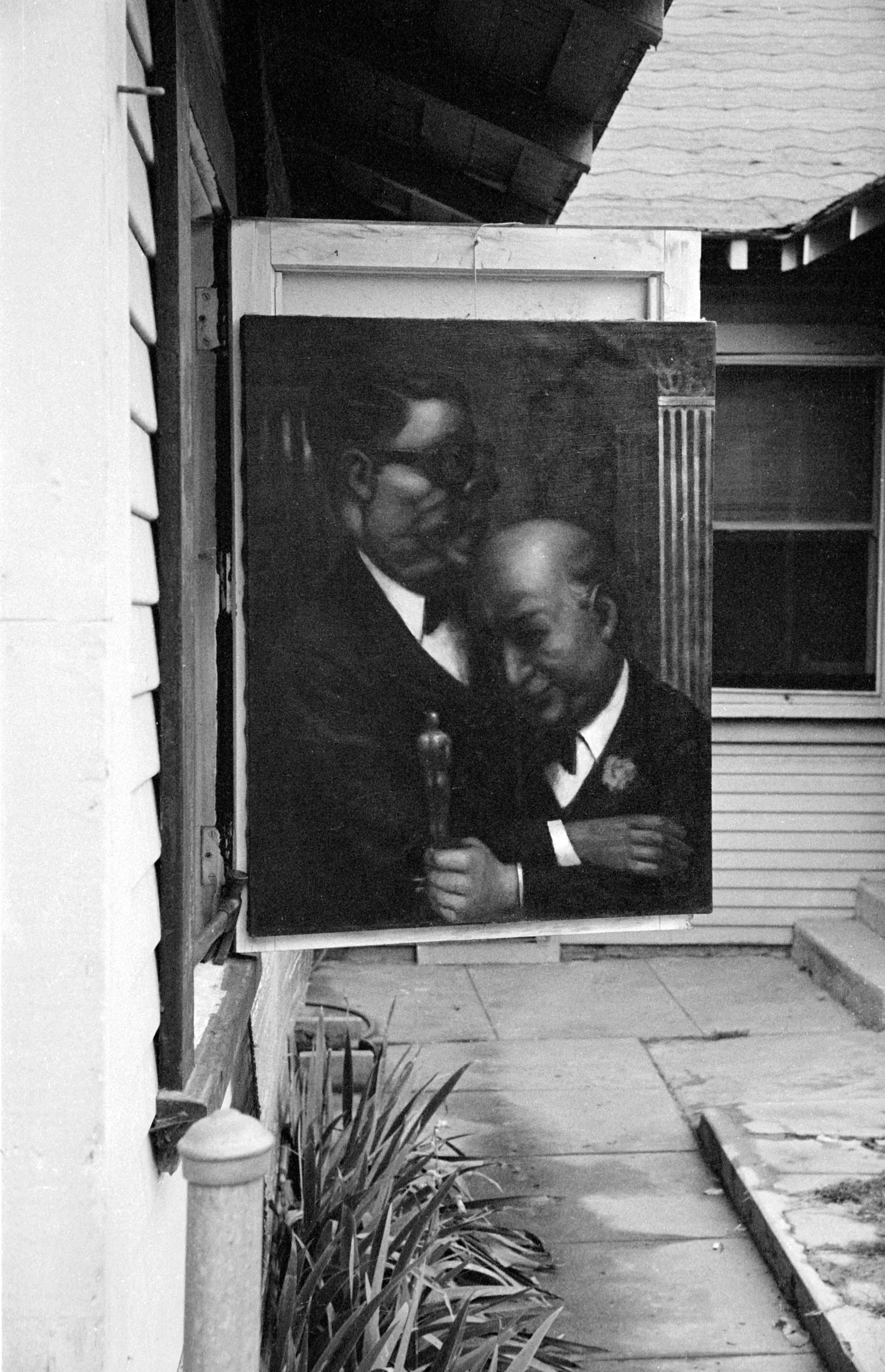 Black and white photograph of a large dark oil painting depicting two men in suits propped against the exterior clapboard wall of a house