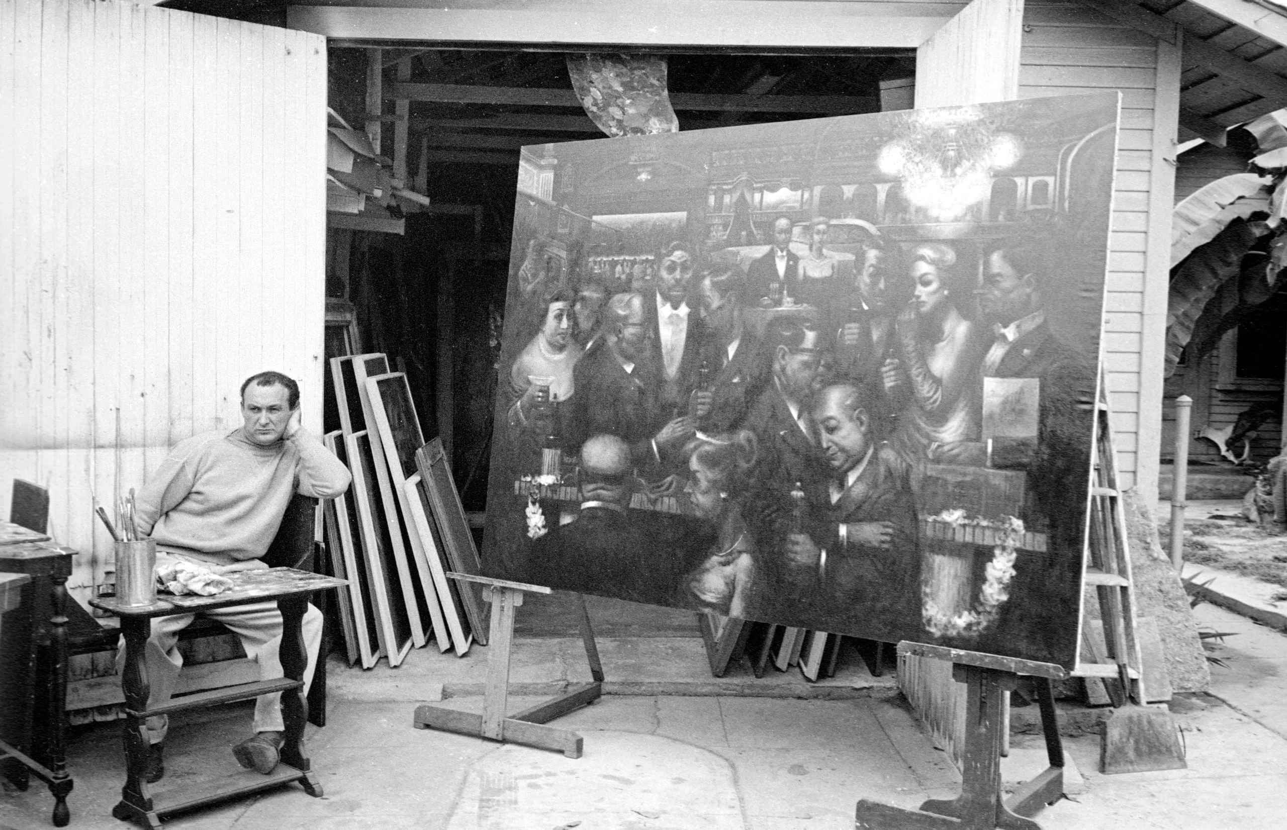 Black and white photograph of a man in a sweater seated beside an enormous multi-figure painting on an outdoor easel in front of a studio doorway