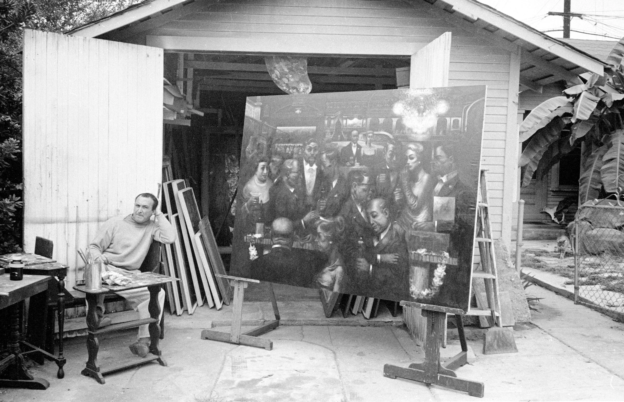 Black and white photograph of a man seated at a worktable beside a large figurative painting on an easel outside a garage studio