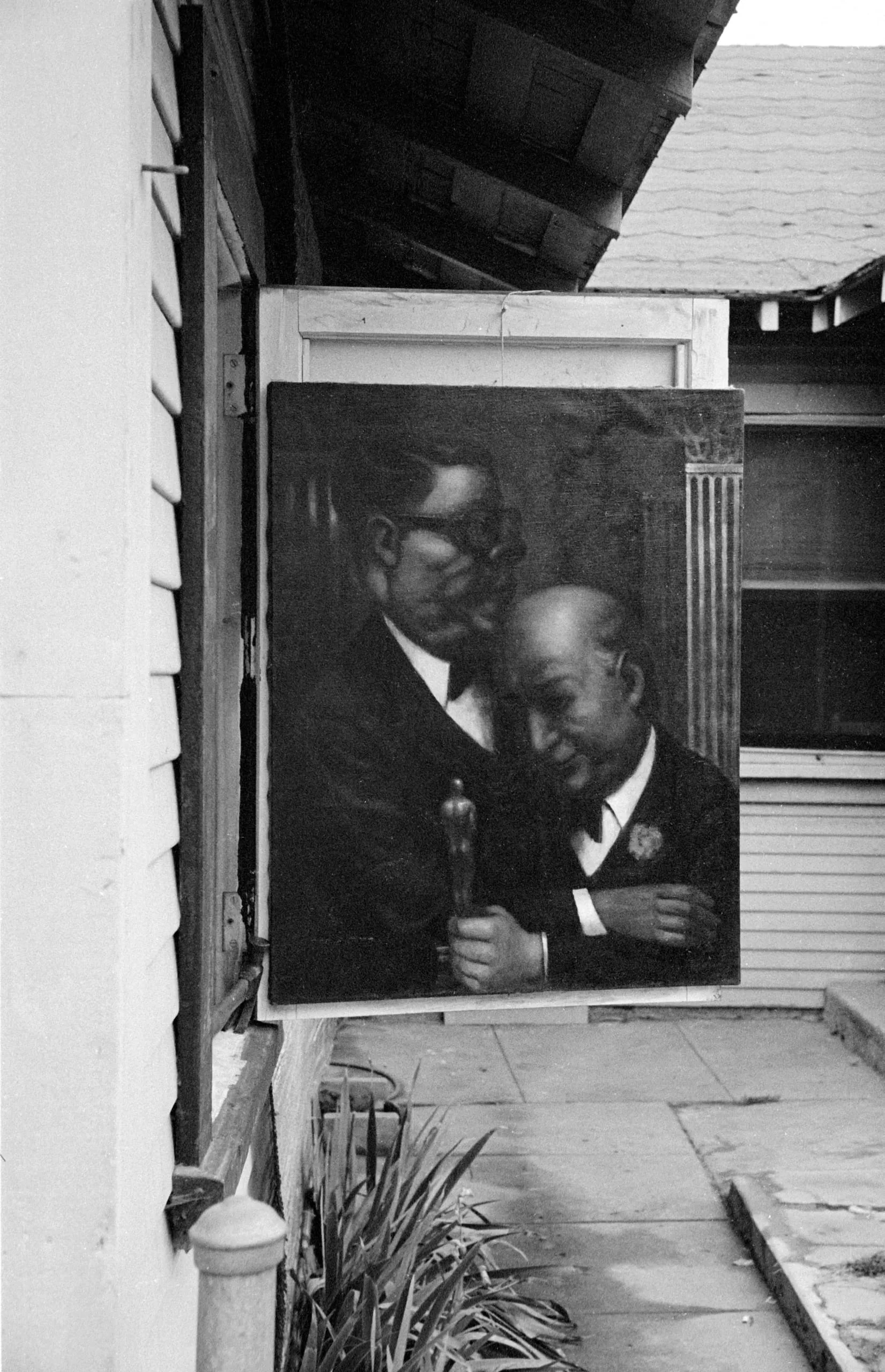 Black and white photograph of a large dark oil painting propped against a house exterior, depicting two older men in suits holding a small figurine between them