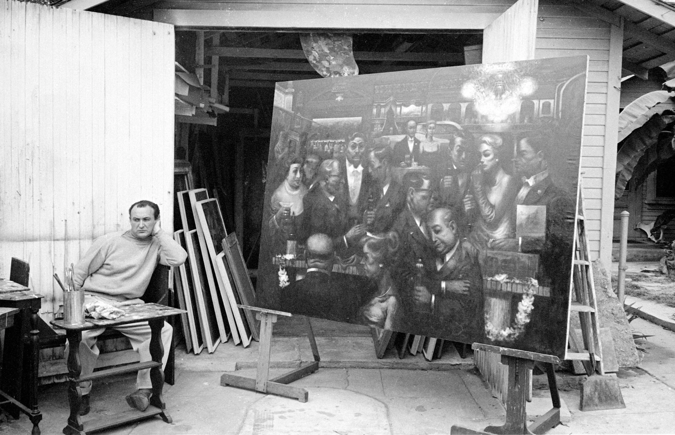 Black and white photograph of a man seated beside a large, dark narrative painting on an easel in an outdoor studio, resting his chin on his hand