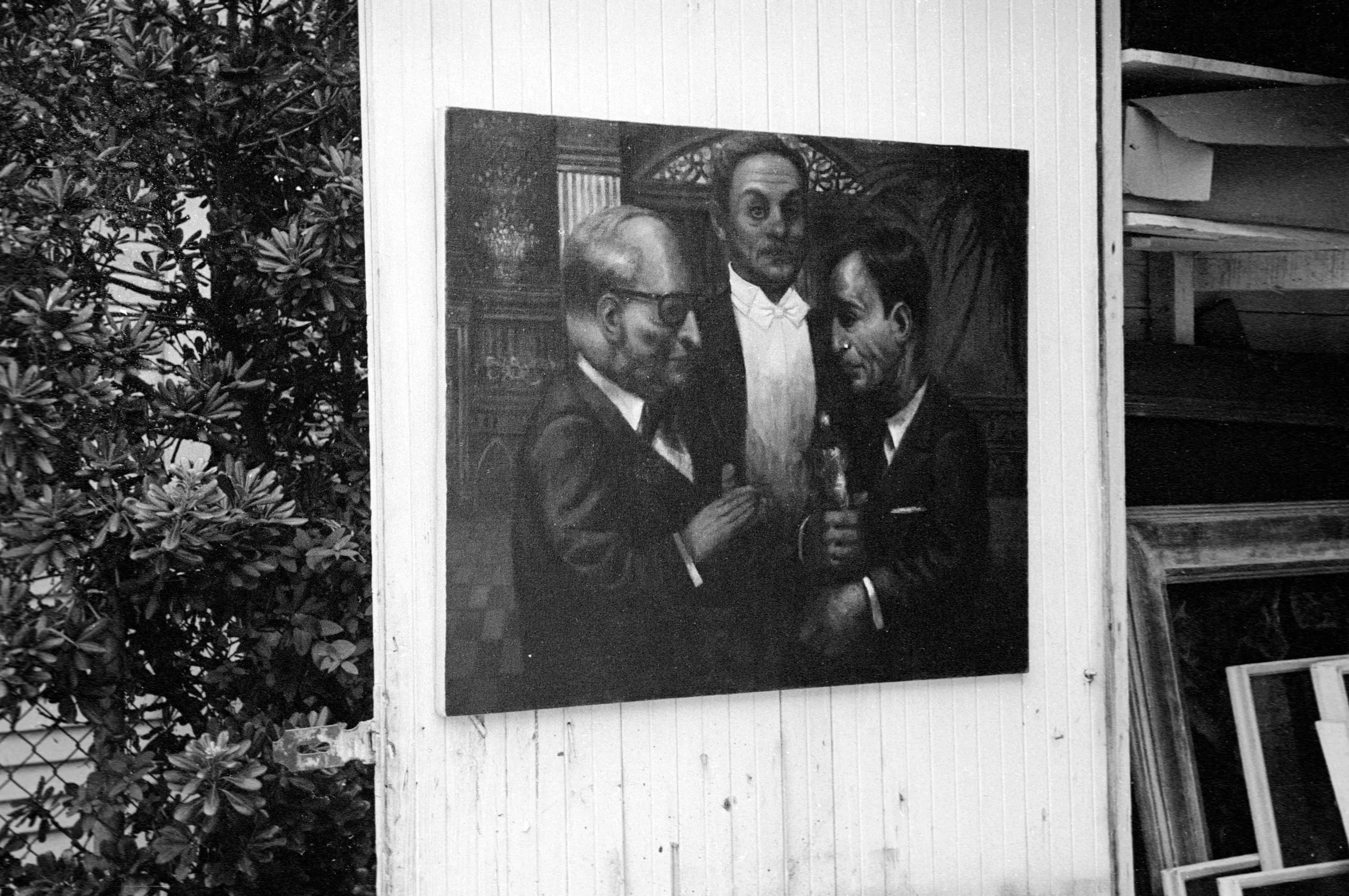 Black and white photograph of a large dark figurative painting hung on a white exterior wall, depicting three men in formal suits gathered closely together