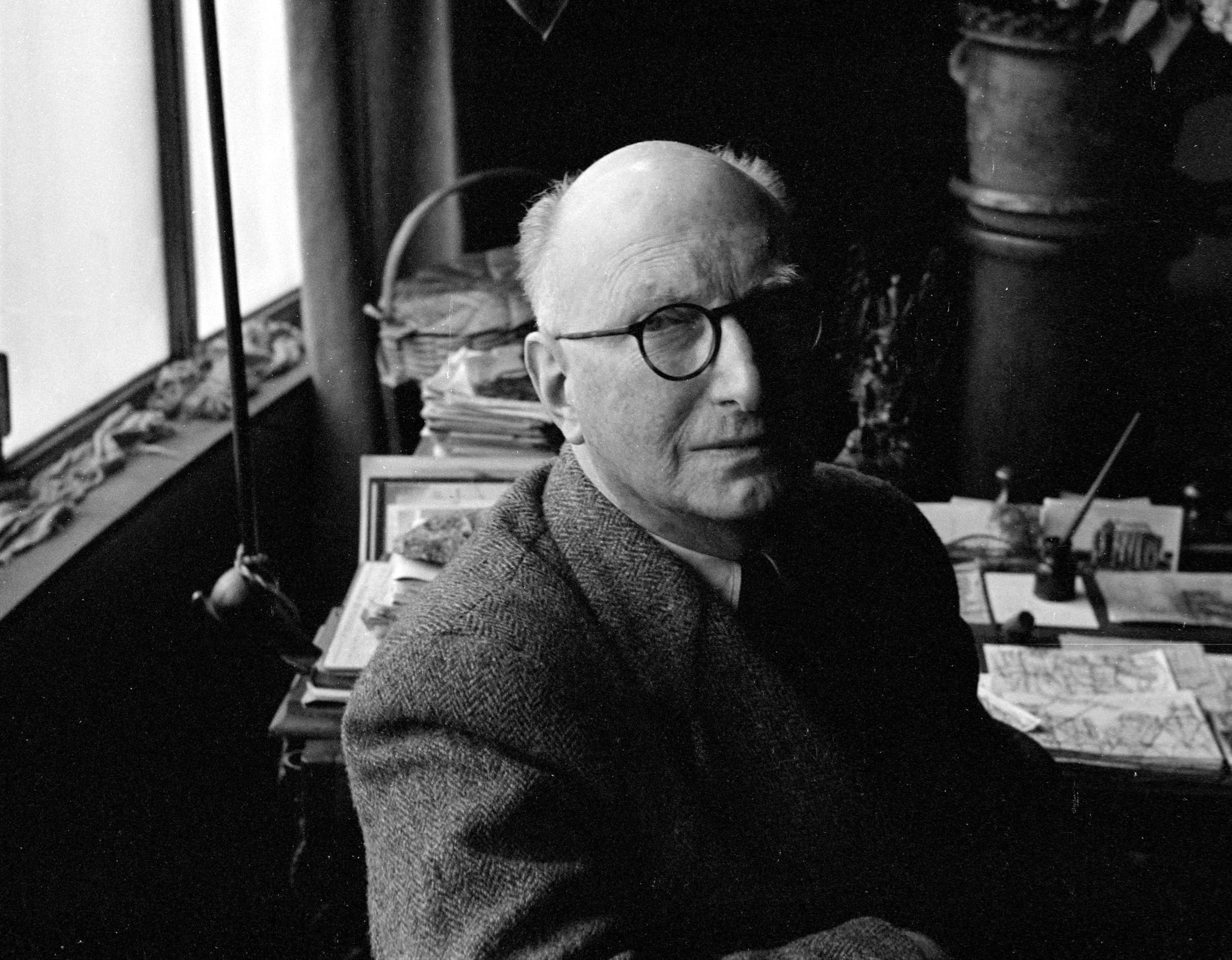 Black and white photograph, older bald white man with round wire-framed glasses, seated in a cluttered studio, soft light from a window to his left