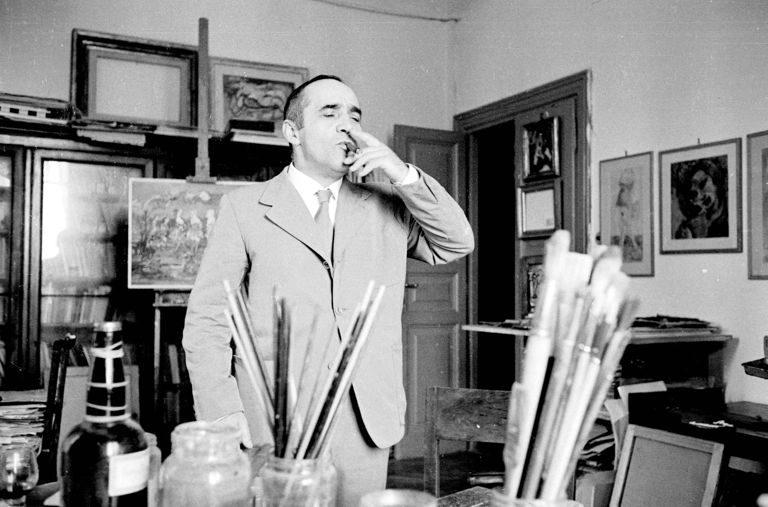 Black and white photograph of a man in a suit standing in an artist's studio, hand raised to his face, surrounded by paintbrushes and framed works