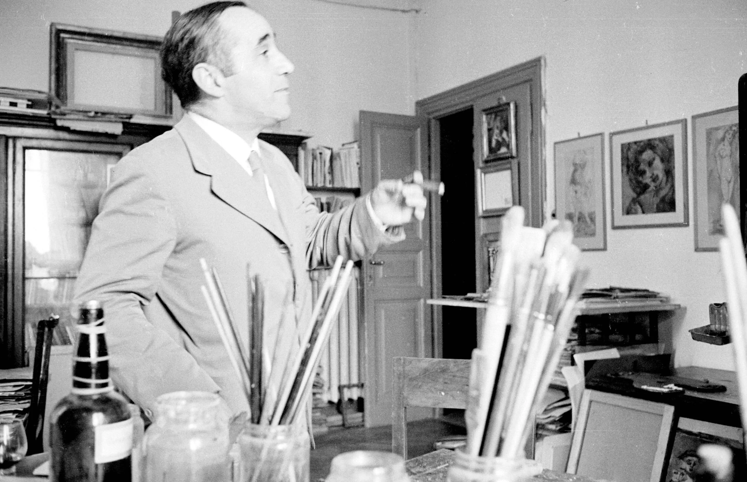 Black and white photograph of a man in a suit jacket standing in an artist's studio, arm extended pointing, with jars of paintbrushes in the foreground and framed works on the wall behind him
