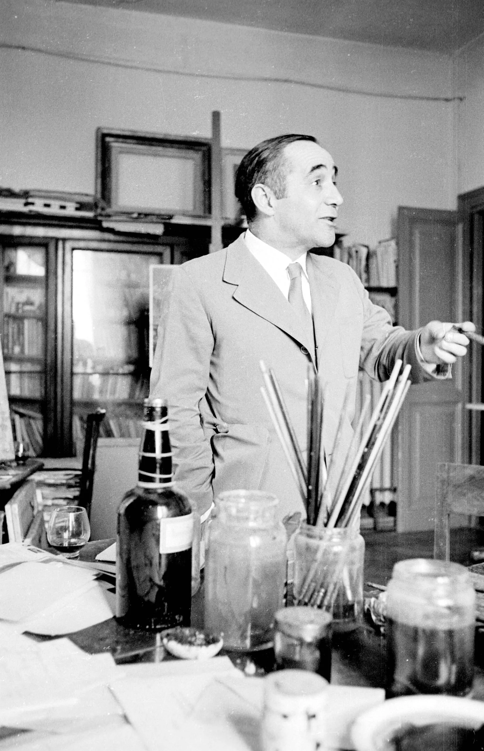 Black and white photograph of a dark-haired man in a suit jacket pointing to the right, standing behind a table cluttered with paintbrushes and jars in an artist's studio