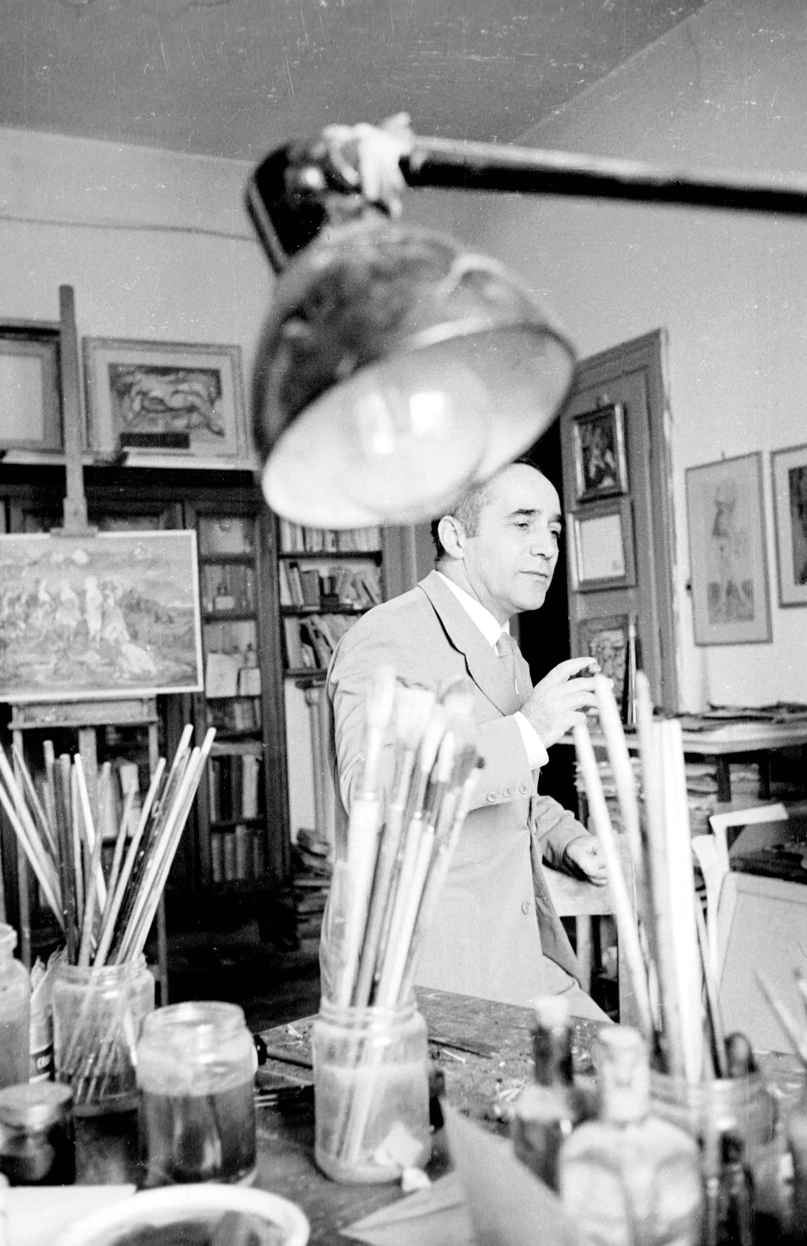 Black and white photograph of a man in a suit jacket standing in a paint-brush-filled artist's studio, photographed from the waist up with a studio lamp hanging in the foreground