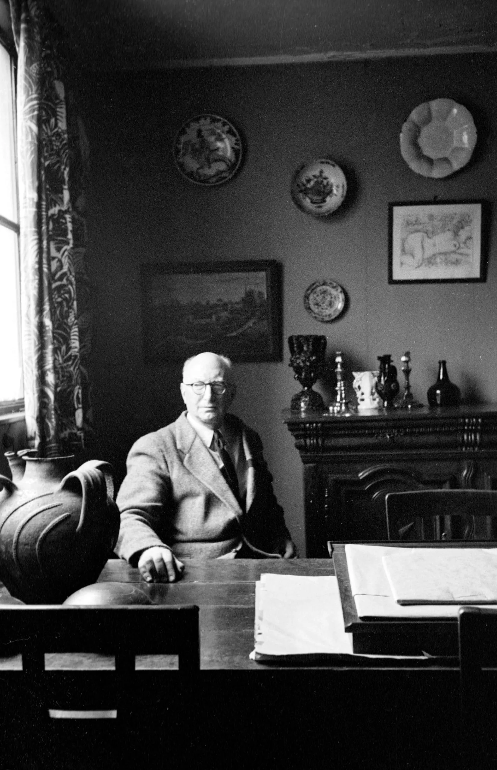 Black and white photograph of a white man in a tweed jacket seated at a wooden table, surrounded by ceramic jugs, mounted decorative plates, and framed artworks