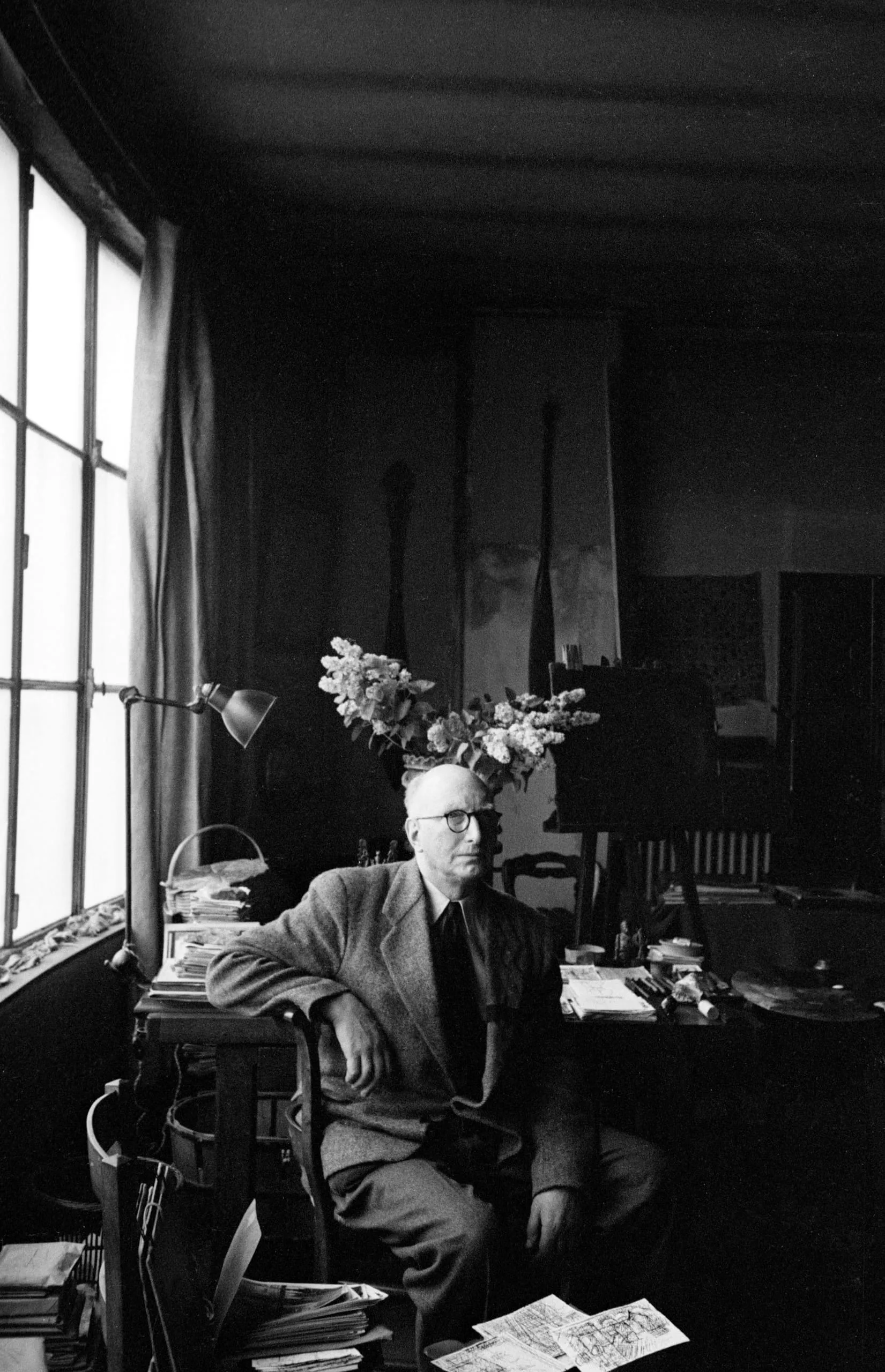 Black and white photograph of an older white man in glasses and a sport coat seated in a chair in a cluttered studio, lit by a large window to the left