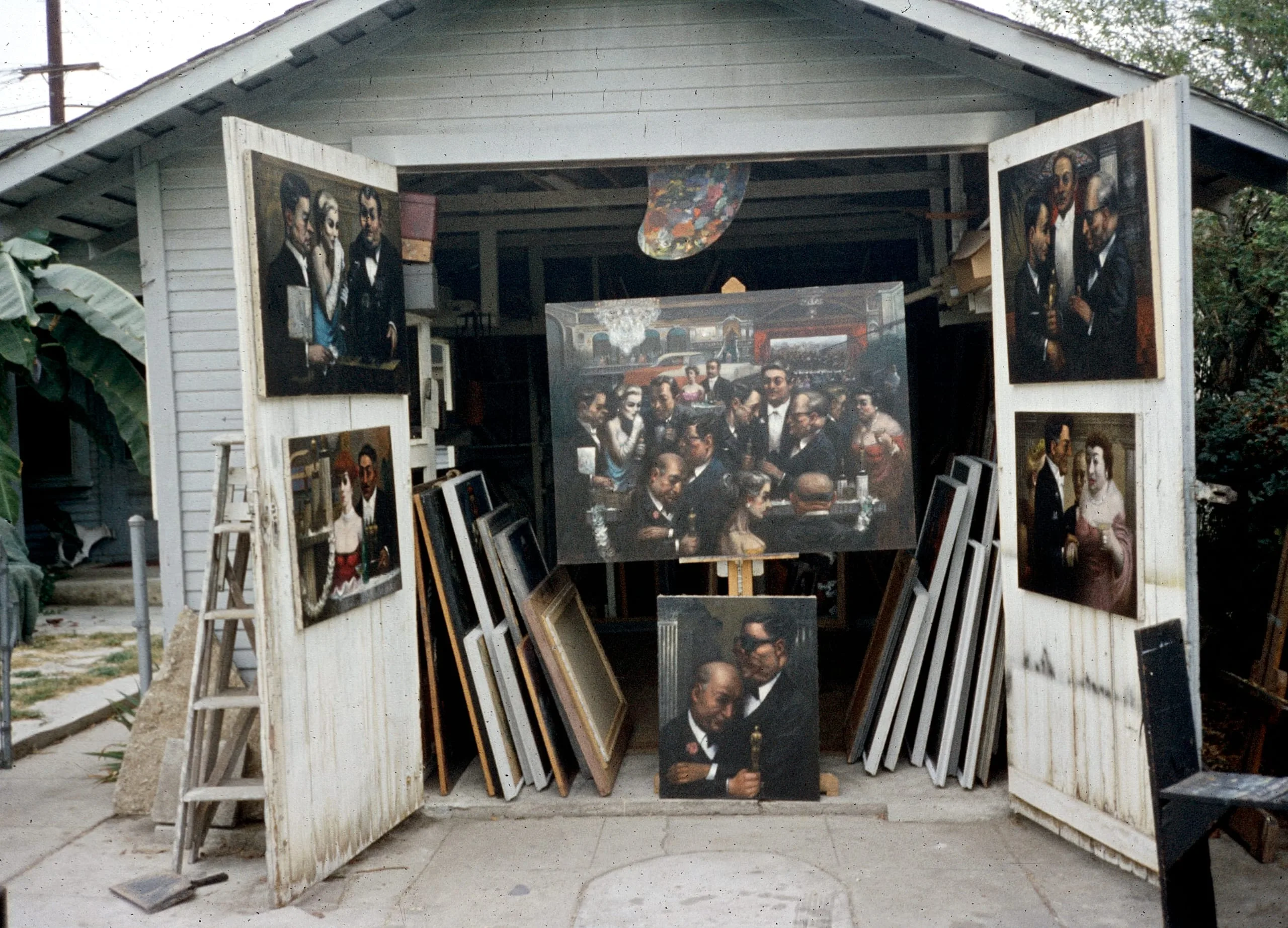 Color photograph of an open white wooden garage studio with large figurative oil paintings displayed on the doors and inside, canvases stacked against walls, central painting on an easel