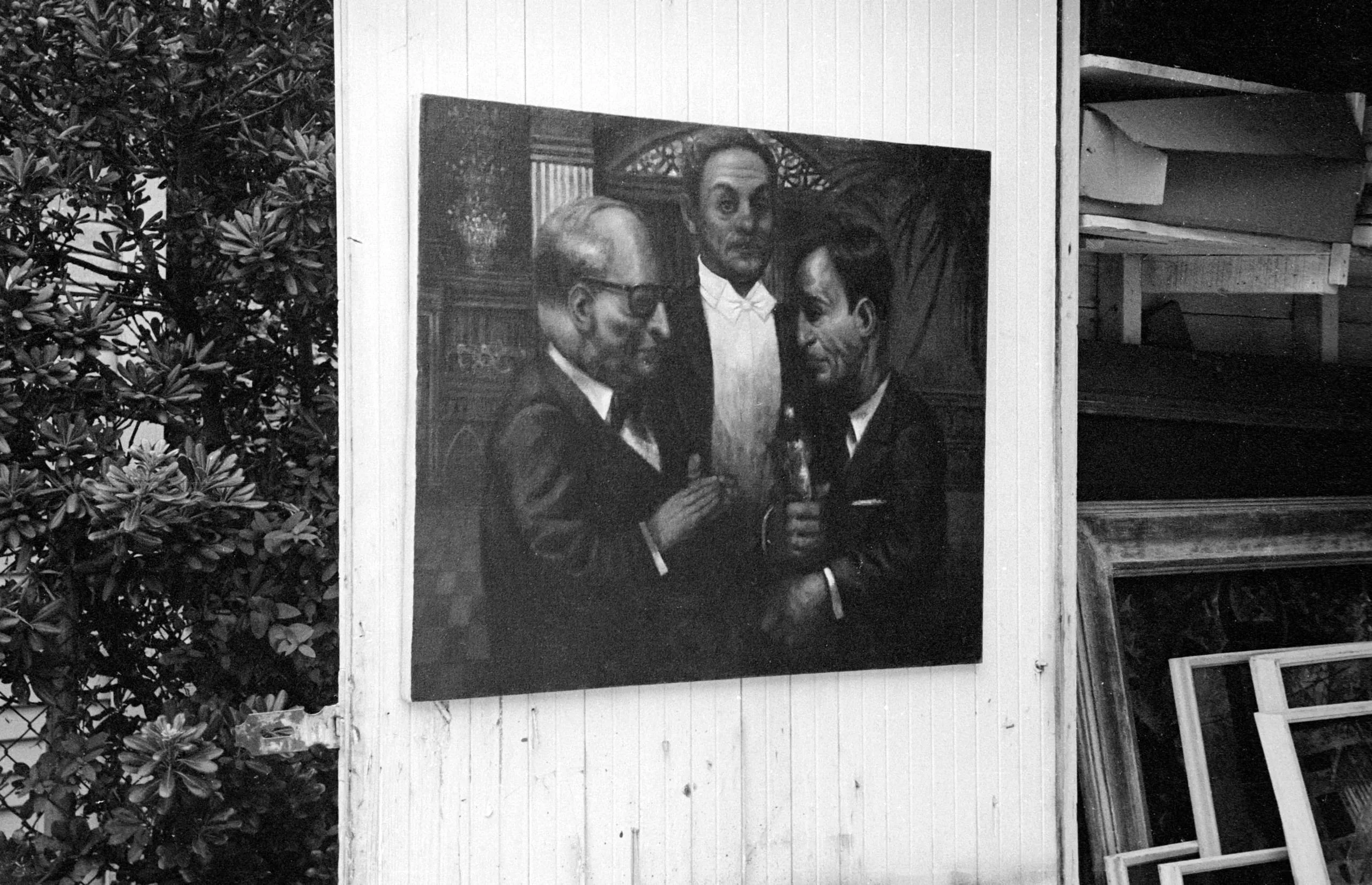 Black and white photograph of a large dark oil painting hung on a white wooden exterior wall, depicting three men in suits clustered together, one holding a bottle