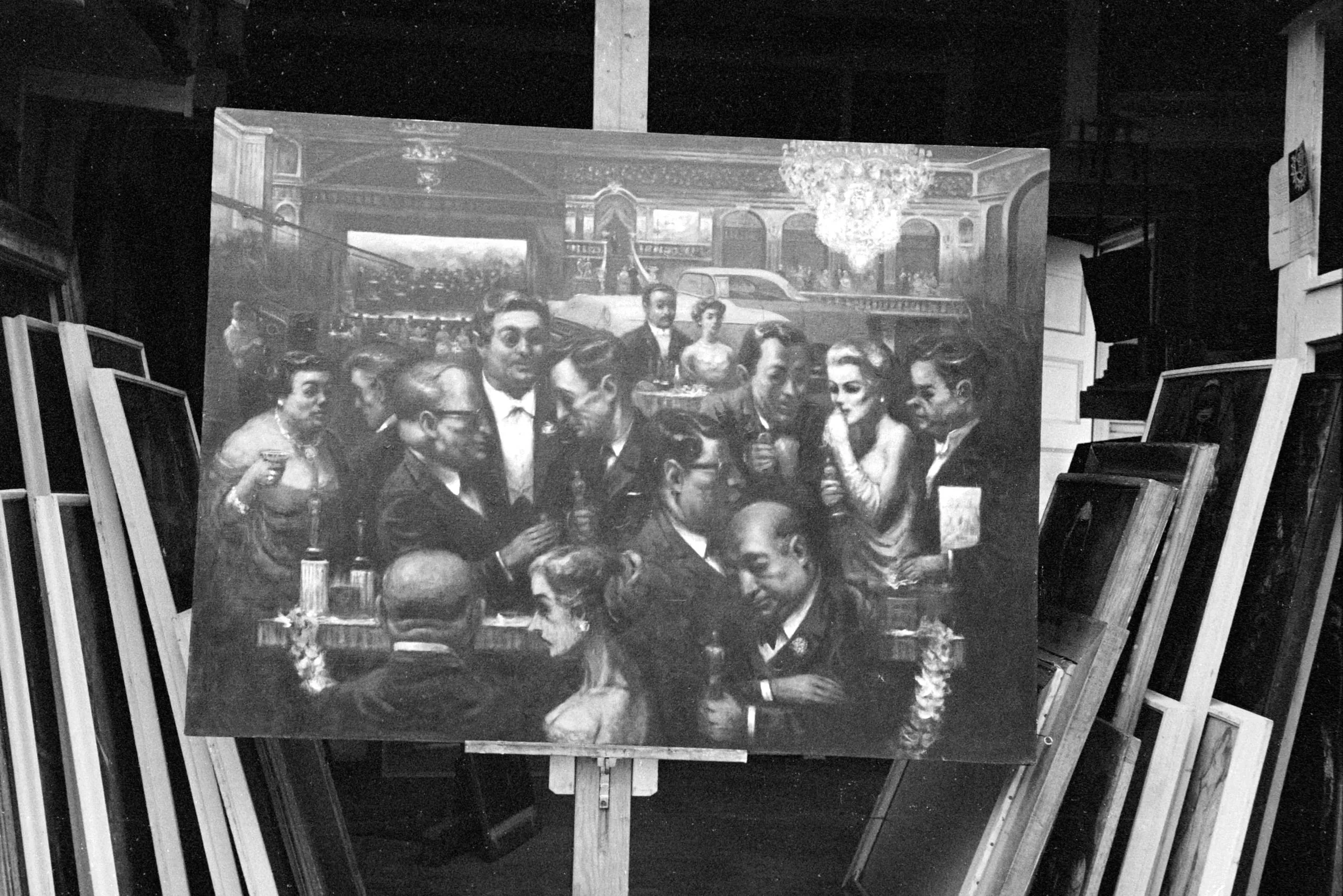 Black and white photograph of a large realist painting on a wooden easel, depicting a crowd of formally dressed figures in an ornate interior with a chandelier