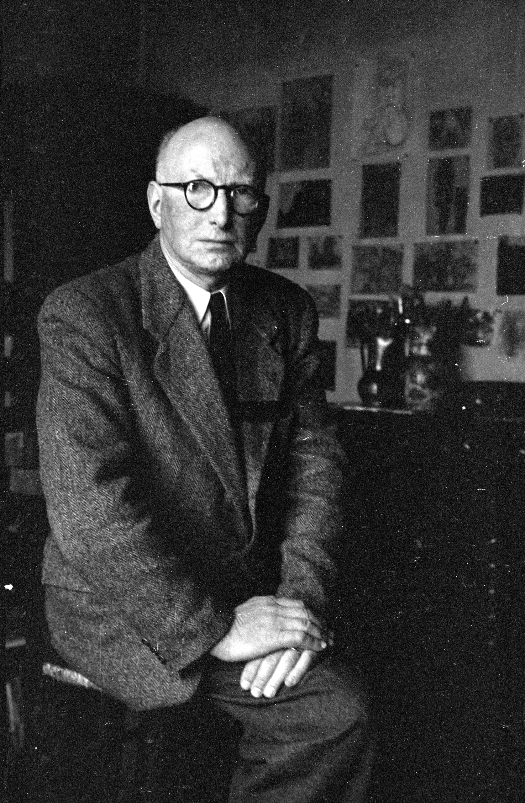 Black and white photograph of a bald, older white man in round glasses and a dark blazer, seated with hands clasped, in front of a wall covered with small pinned images