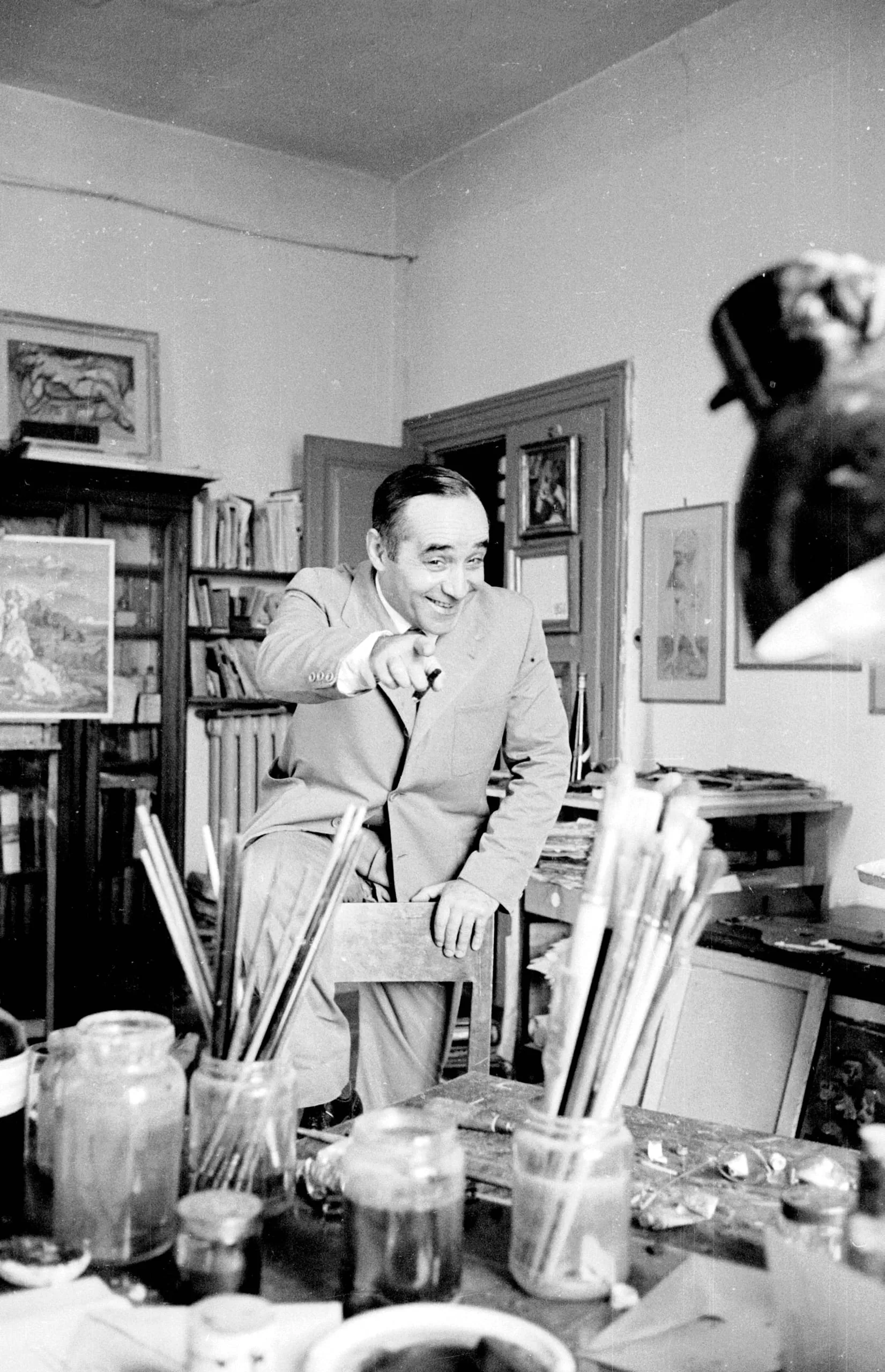 Black and white photograph of a smiling man in a light suit seated in an artist's studio, leaning forward and pointing at the camera, surrounded by paintbrushes, jars, and artworks