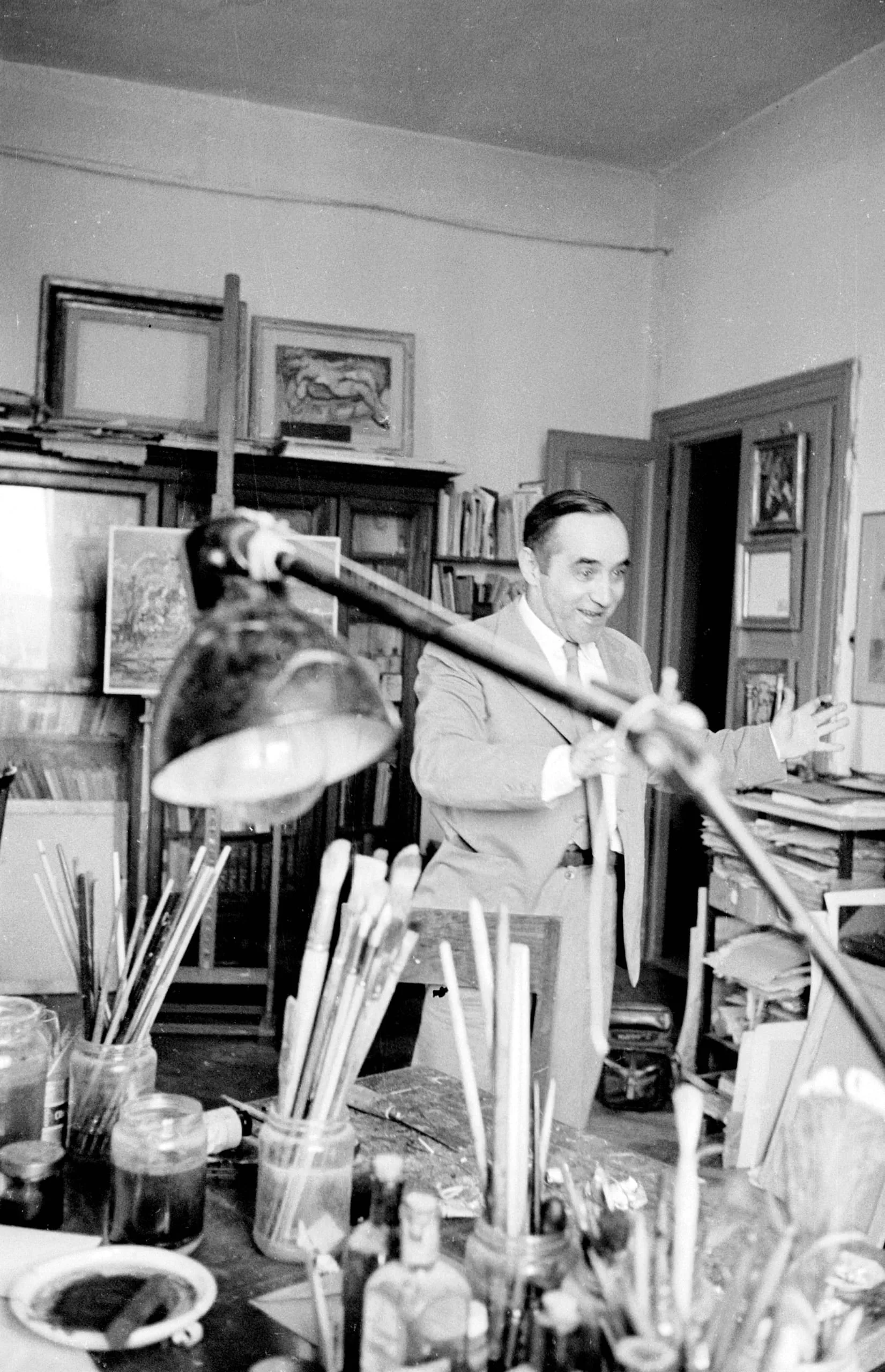 Black and white photograph of a man in a blazer standing in a painter's studio, surrounded by brushes, jars, canvases, and a large adjustable desk lamp in the foreground