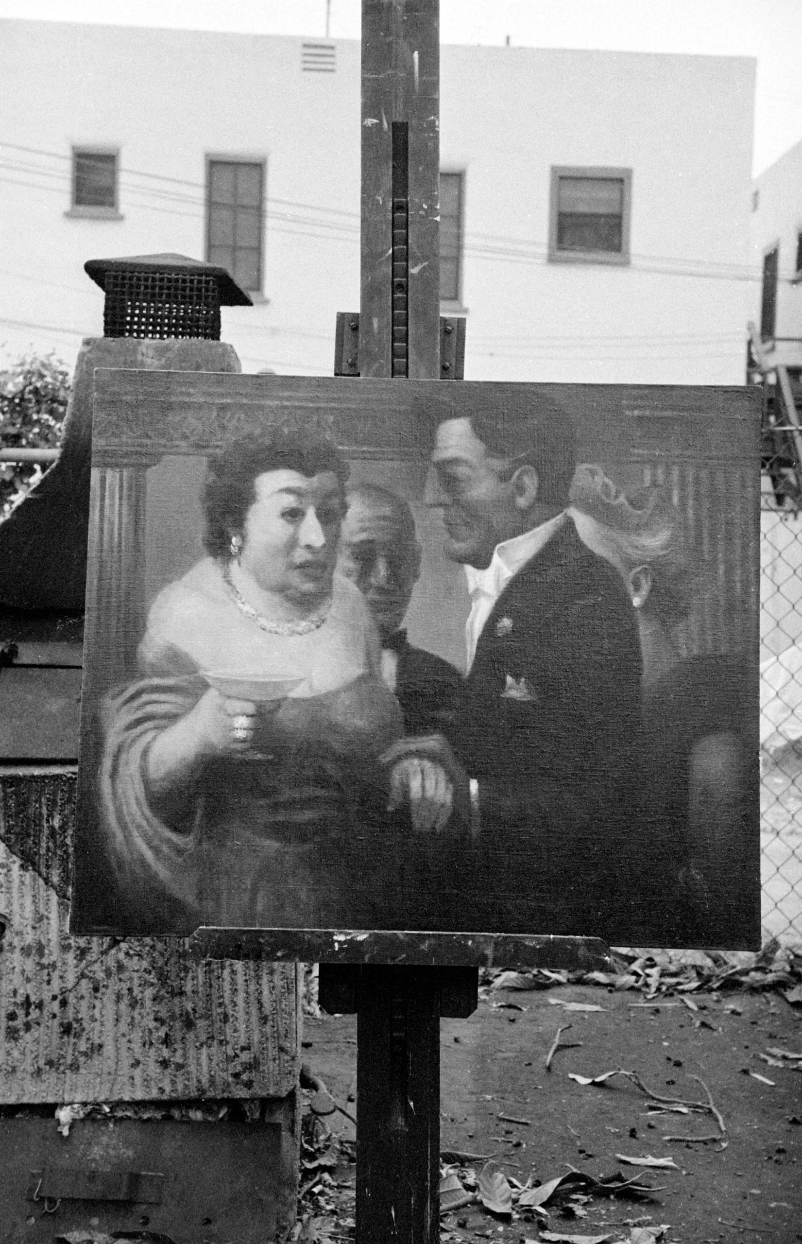 Black and white photograph of a realistic oil painting on an outdoor easel, depicting three figures in formal attire at a social gathering, with a chain-link fence and building in the background