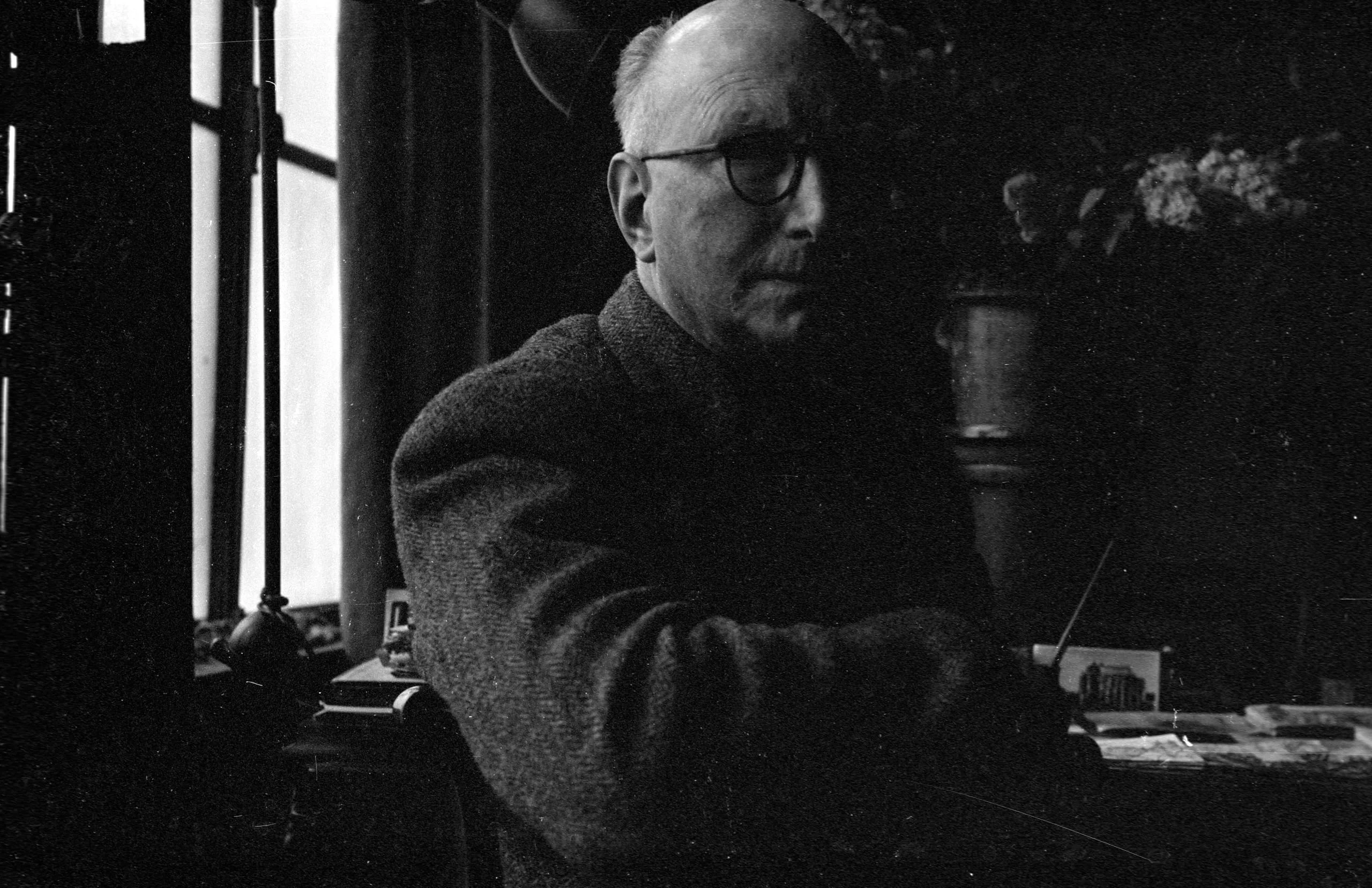 Black and white photograph of a white man in a wool crewneck sweater and round glasses, seated at a desk near a window, looking downward