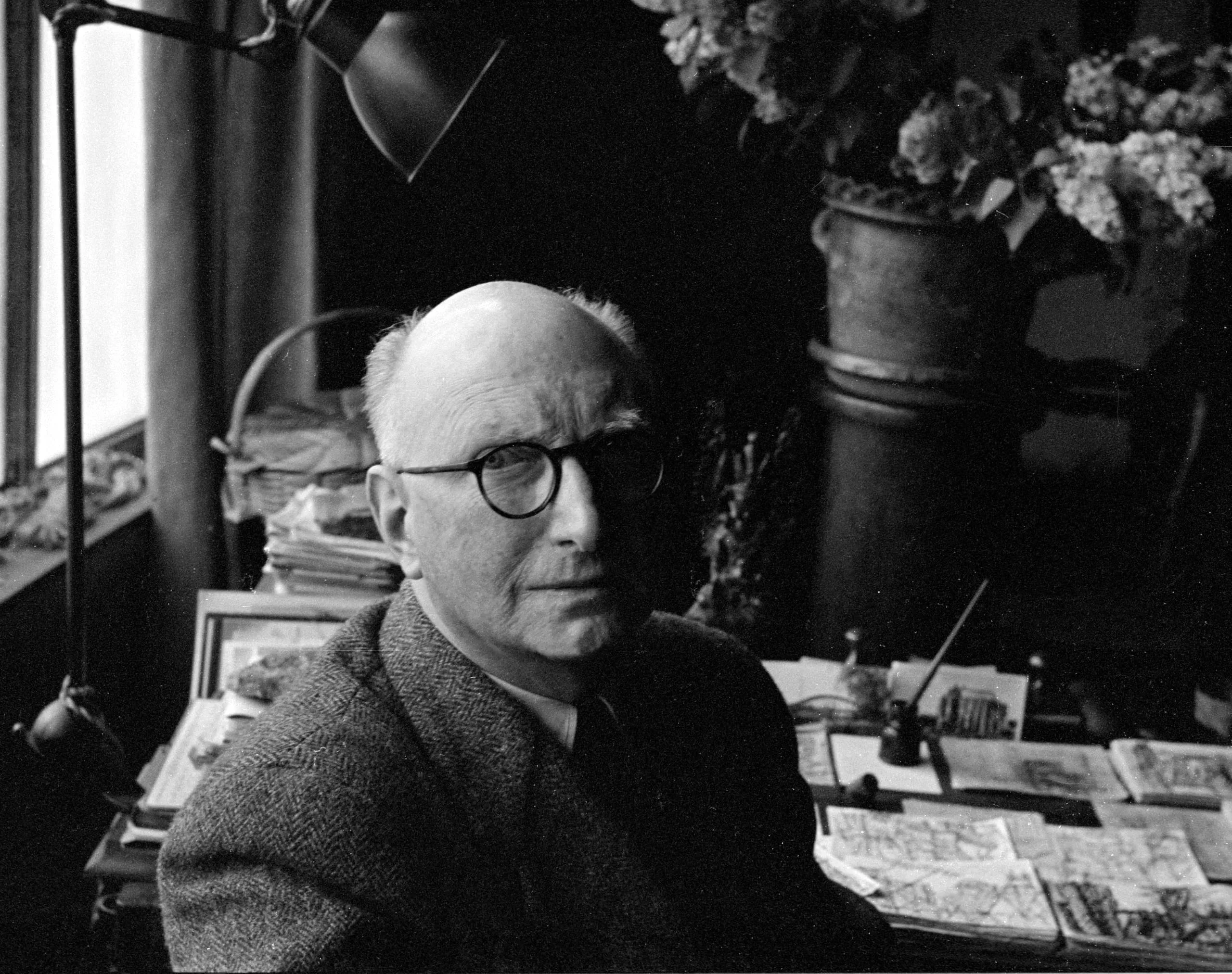 Black and white photograph of an older bald man in round glasses and tweed jacket seated at a paper-strewn desk, turning to face the camera