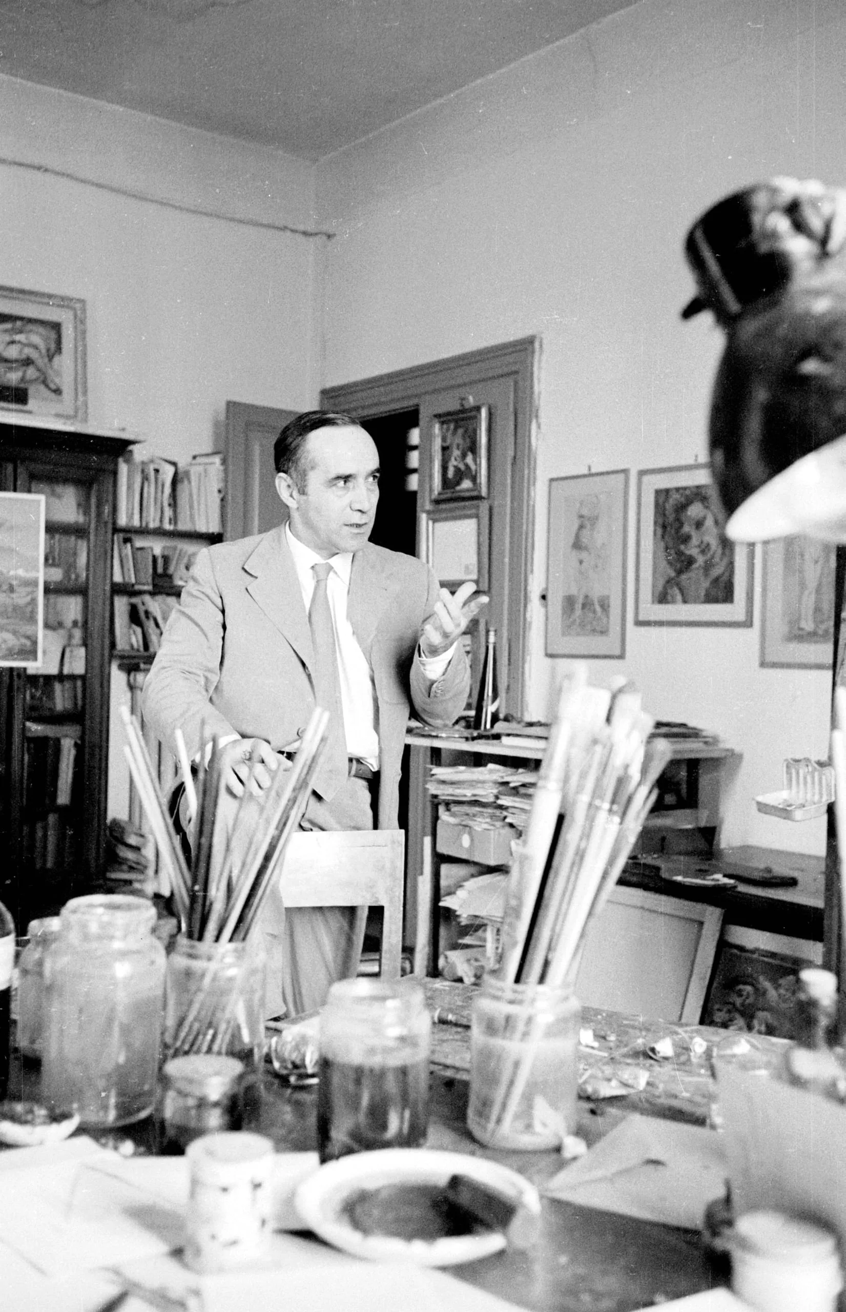 Black and white photograph of a man in a suit standing in a cluttered artist's studio, gesturing with one hand, surrounded by paintbrushes and framed artworks