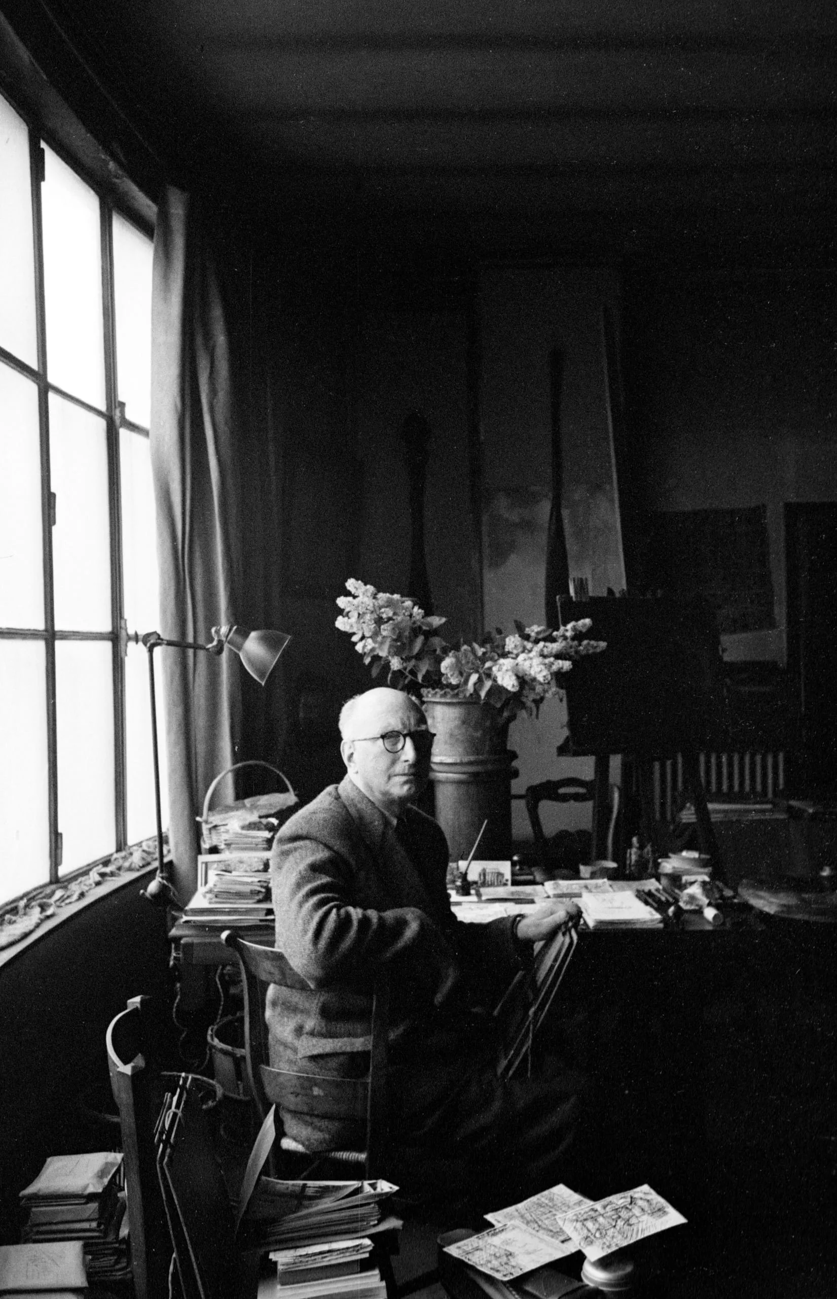 Black and white photograph of an older bald man wearing glasses and a cardigan, seated at a cluttered studio desk, lit by a large window to the left