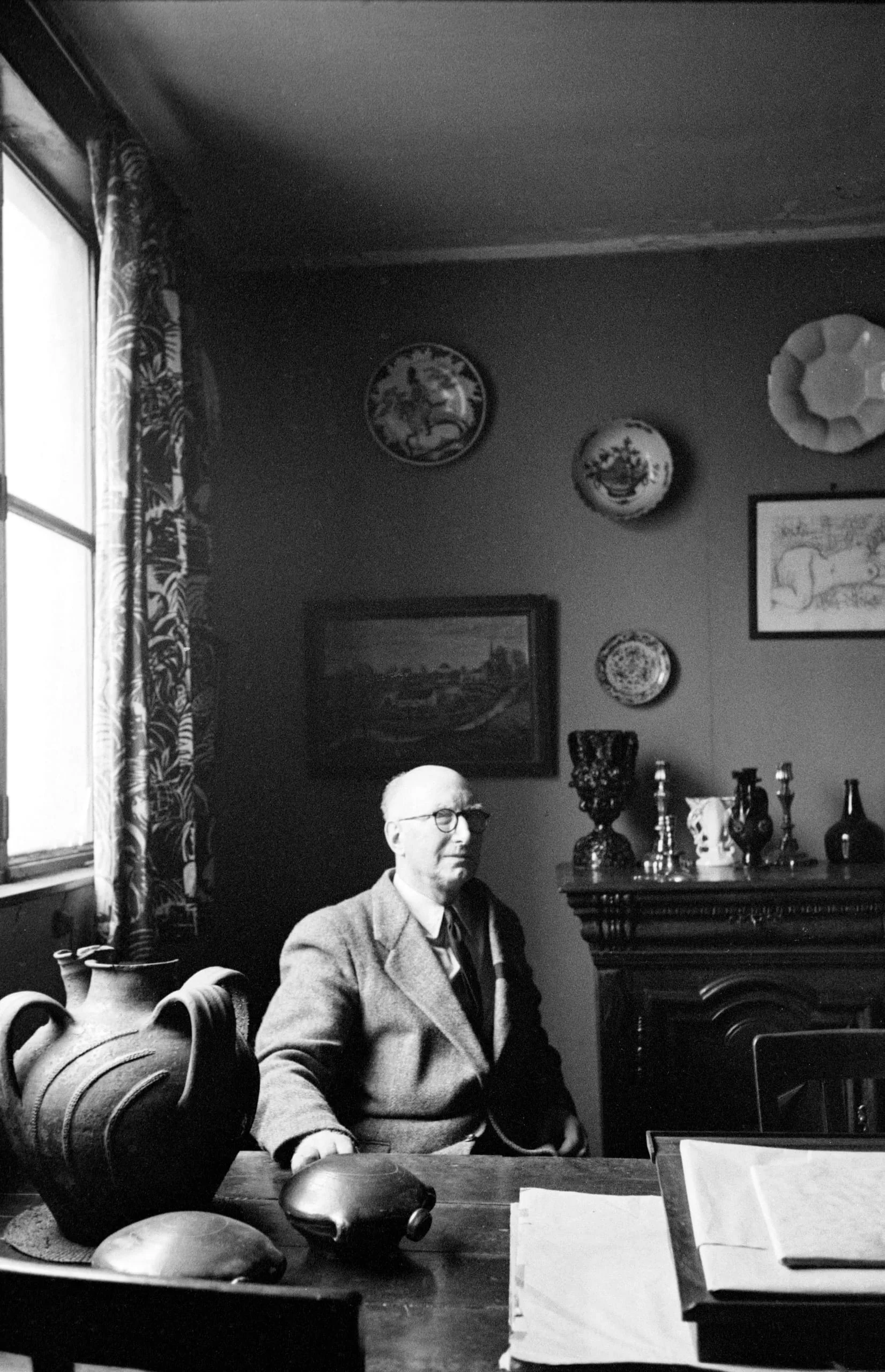 Black and white photograph, white man in tweed blazer seated at a table with large ceramic jugs, surrounded by decorative plates and artwork on dark walls