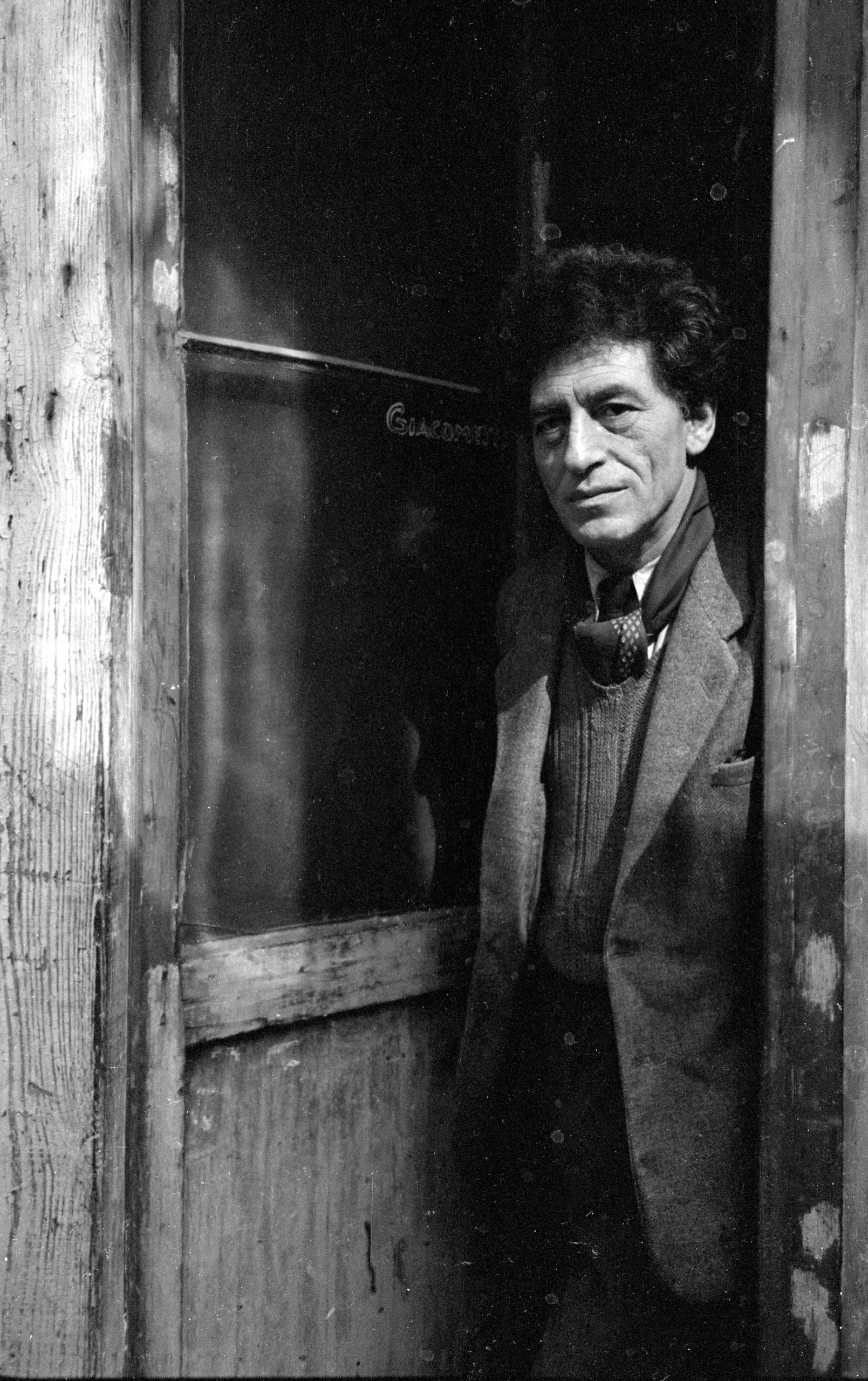 Black and white photograph of a dark-haired man in a tweed jacket and loose tie, standing in a weathered wooden doorway, looking directly at the camera