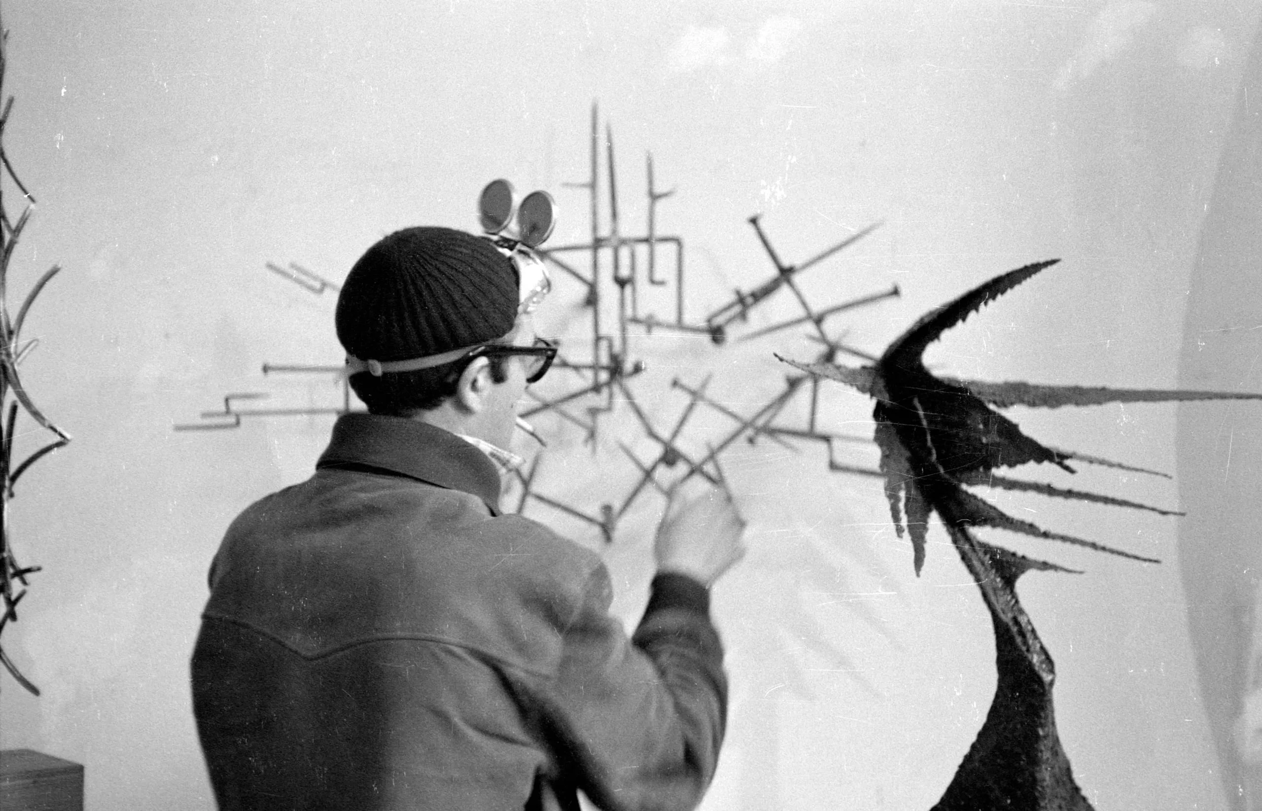 Black and white photograph of a man in a knit cap and heavy jacket, seen from behind, reaching toward a wall-mounted abstract metal rod sculpture, with a jagged dark sculpture in the foreground right