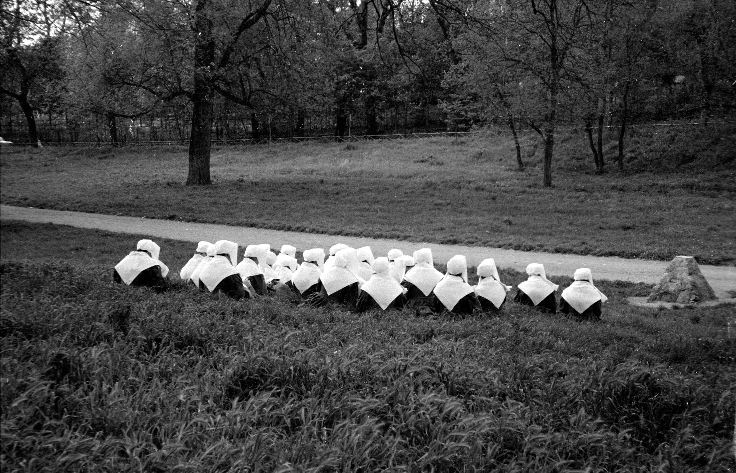 Black and white photograph of a large group of figures in white head coverings kneeling in a park, seen from behind, surrounded by grass and trees