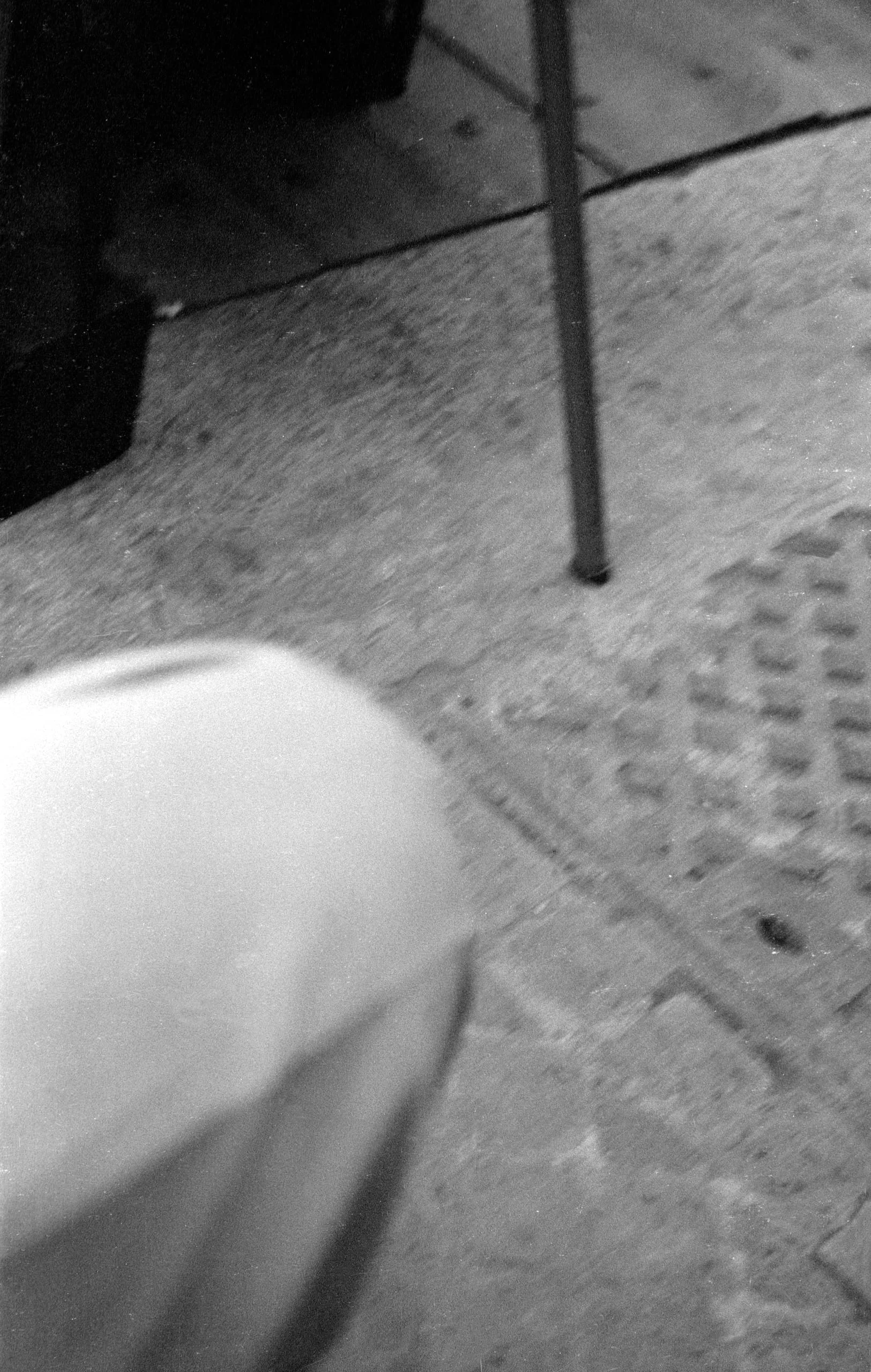 Black and white photograph angled sharply downward toward a sidewalk with an embedded metal grate, a thin rod, and a blurred pale fabric form at lower left