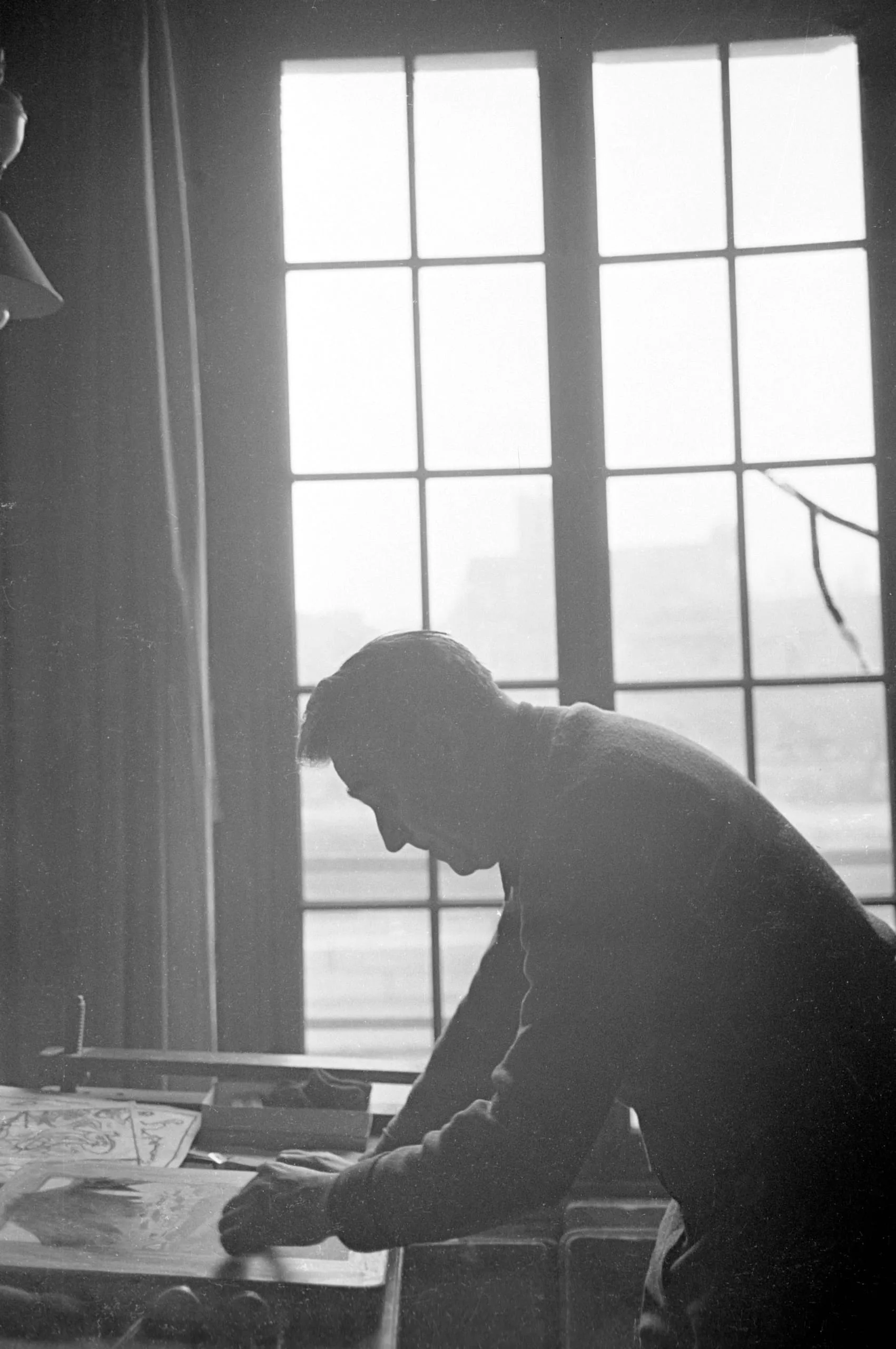 Black and white photograph of a man in silhouette, leaning over a work table near a large studio window with diffused backlighting