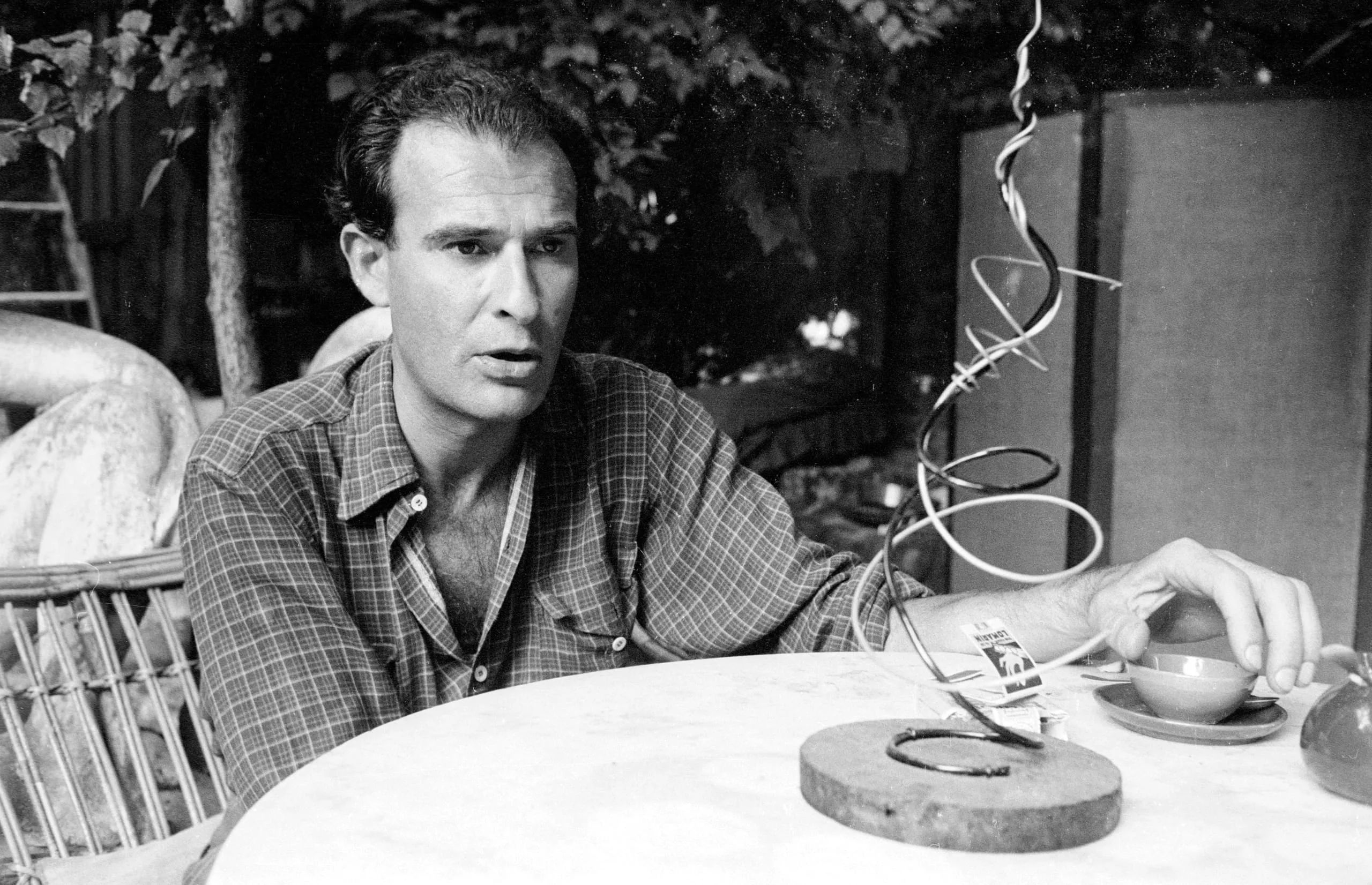Black and white photograph of a man in a plaid shirt seated at a white-clothed table outdoors, his hand resting near a small wire sculpture on a wooden base