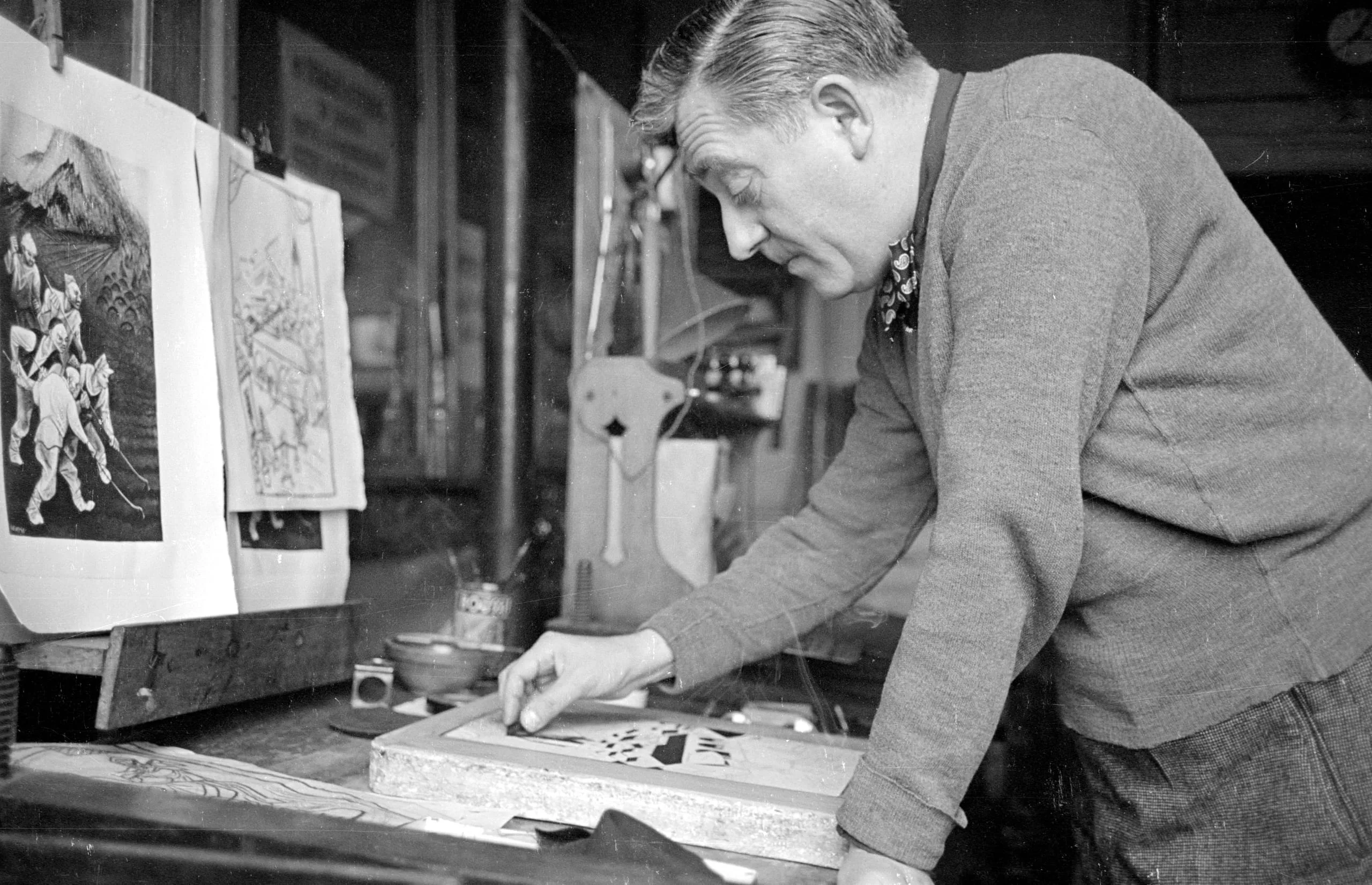 Black and white photograph of a man in a sweater leaning over a carved woodblock or printing plate at a studio worktable, with printed artworks pinned to the wall behind him