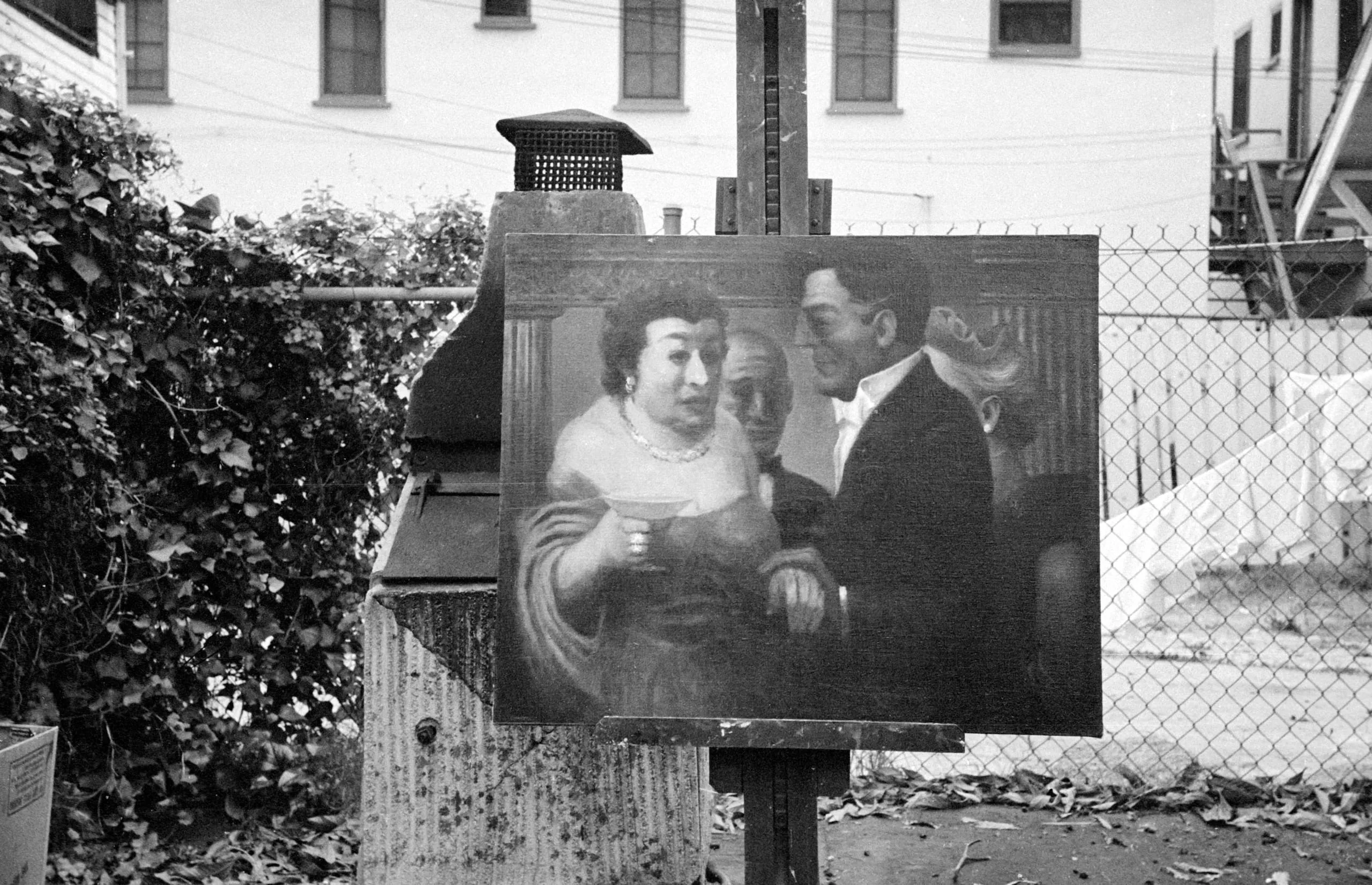 Black and white photograph of a framed figurative painting on a wooden easel outdoors, depicting three figures — a heavyset woman in a shawl, a shadowed figure behind her, and a man in a bow tie — set against urban buildings and a chain-link fence