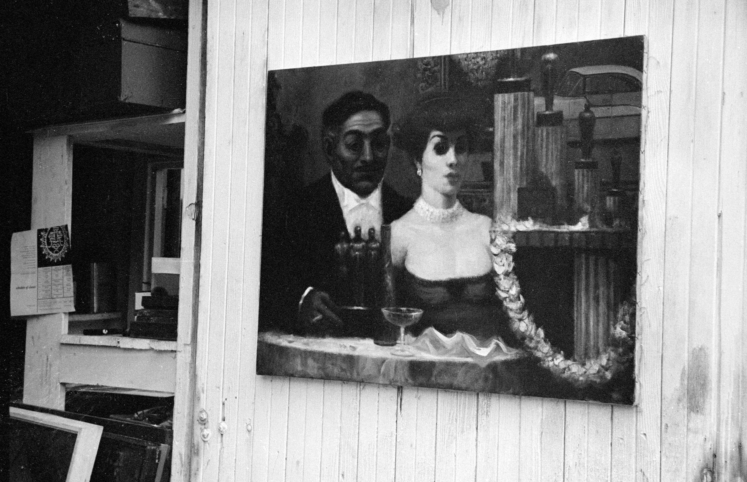 Black and white photograph of a dark-toned figurative painting hung on a white plank wall, depicting a Black man in a suit and a pale-skinned woman in evening dress standing at a bar